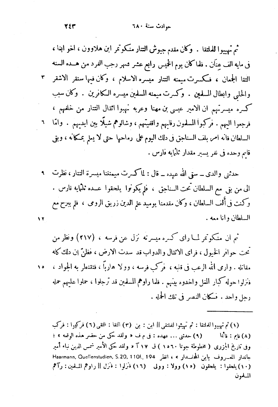 (9) حدثنى. . . عهده: فى م ف «ولقد حكى من حضر هذه الوقعه»؛ وفى تاريخ الجزرى (مخطوطة جوتا 1560) ق 17 آ «ولقد حكى الأمير شمس الدين نباء أمير جاندار المعروف بابن المحفدار»، انظر Haarmann,Quellenstudien,S .02,011 f ,491