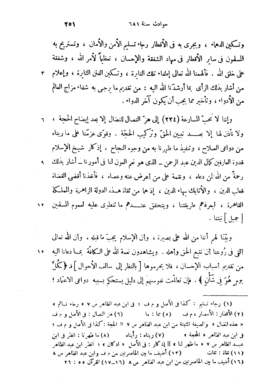 وإننا لا نحبّ المسارعة (224) إلى هزّ النصال للنضال (6) إلا بعد إيضاح الحجة، ولا نأذن لها إلا بعد تبيين الحقّ وتركيب الحجّة. وقوّى عزمنا على ما ريناه (7) من دواعى الصلاح، وتنفيذ ما ظهرنا (8) به من وجوه النجاح، إذكار شيخ الإسلام قدوة العارفين كمال الدين عبد الرحمن-الذى هو نعم العون لنا فى أمورنا-أشار بذلك رحمة من الله لمن دعاه، ونقمة على من أعرض عنه وعصاه، فأنفذنا أقضى القضاة قطب الدين، والأتابك بهاء الدين، إذ هما من ثقاة (11) هذه الدولة الزاهرة والمملكة القاهرة، ليعرفاهم طريقتنا، ويتحقق عندهم ما تنطوى عليه لعموم المسلمين [جميل] (13) نيتنا.