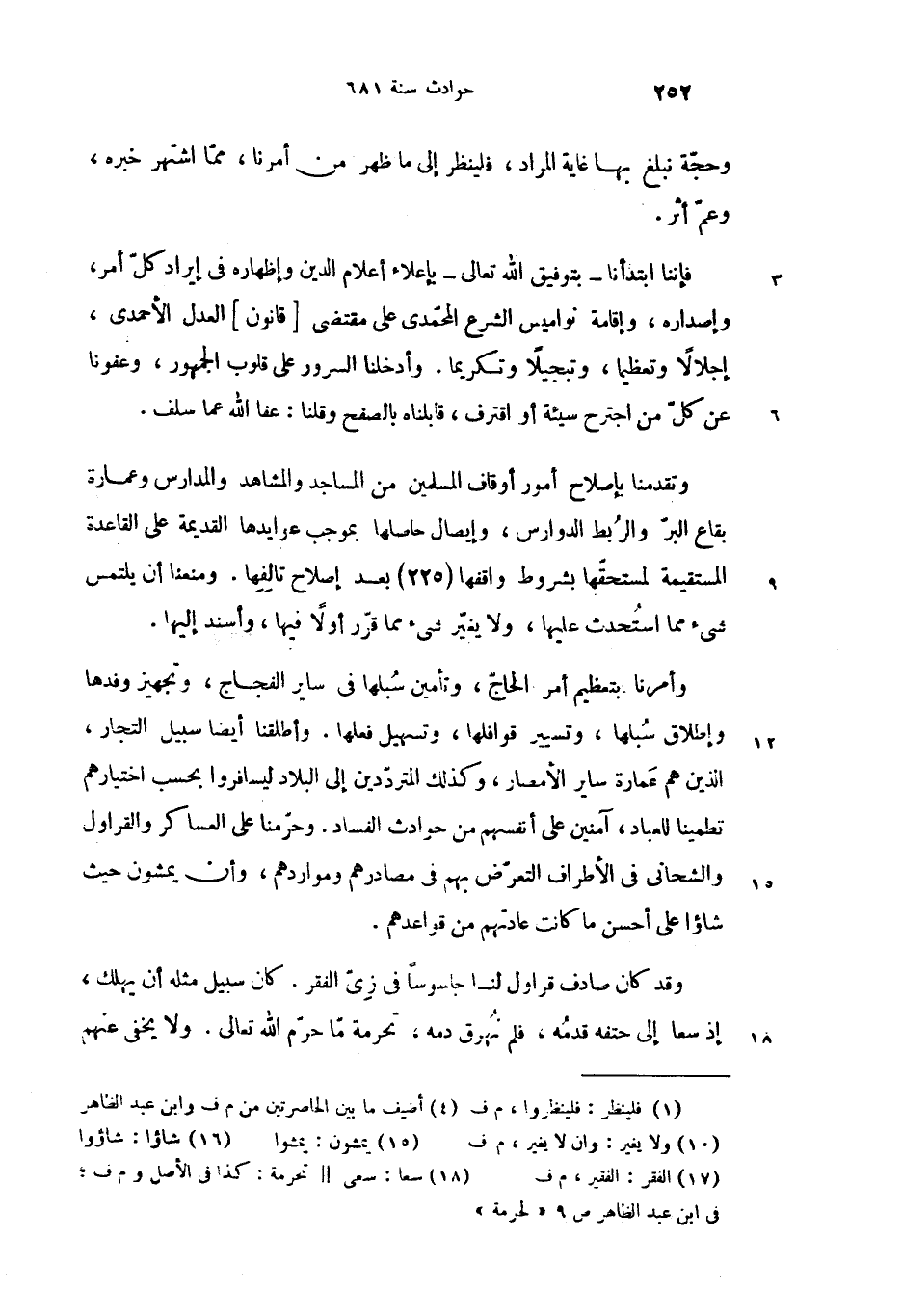 وأمرنا بتعظيم أمر الحاجّ، وتأمين سبلها فى ساير الفجاج، وتجهيز وفدها وإطلاق سبلها، وتسيير قوافلها، وتسهيل فعلها. وأطلقنا أيضا سبيل التجار، الذين هم عمارة ساير الأمصار، وكذلك المتردّدين إلى البلاد ليسافروا بحسب اختيارهم تطمينا للعباد، آمنين على أنفسهم من حوادث الفساد. وحرّمنا على العساكر والقراول والشحانى فى الأطراف التعرّض بهم فى مصادرهم ومواردهم، وأن يمشون (15) حيث شاؤا (16) على أحسن ما كانت عادتهم من قواعدهم.
