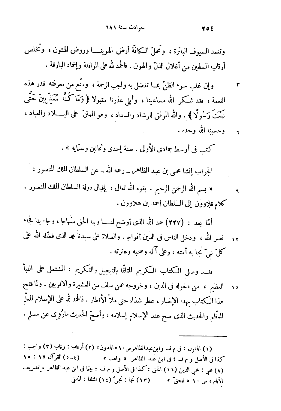 فقد وصل الكتاب الكريم المتلقّا (14) بالتبجيل والتكريم، المشتمل على النبأ العظيم، من دخوله فى الدين، وخروجه عمن سلف من العشيرة والاقربين. ولما فتح هذا الكتاب بهذا الإخبار، عطر شذاه حتى ملأ الأقطار. فالحمد لله على الإسلام المعلّم المعظّم والحديث الذى صح عند الإسلام إسلامه، وأصحّ الحديث ماروى عن مسلم.