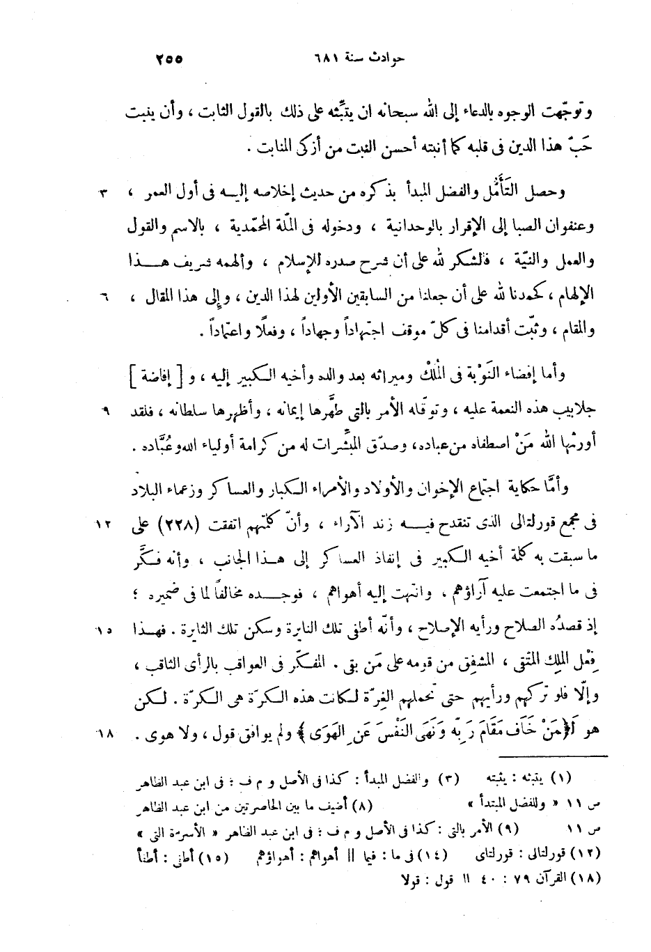 وأمّا حكاية اجتماع الإخوان والأولاد والأمراء الكبار والعساكر وزعماء البلاد فى مجمع قورلتالى (12) الذى تنقدح فيه زند الآراء، وأنّ كلمتهم اتفقت (228) على ما سبقت به كلمة أخيه الكبير فى إنفاذ العساكر إلى هذا الجانب، وأنه فكّر فى ما (14) اجتمعت عليه آراؤهم، وانتهت إليه أهواهم، فوجده مخالفا لما فى ضميره؛ إذ قصده الصلاح ورأيه الإصلاح، وأنّه أطفى (15) تلك النايرة وسكن تلك الثايرة. فهذا فعل الملك المتّقى، المشفق من قومه على من بقى، المفكّر فى العواقب بالرأى الثاقب، وإلاّ فلو تركهم ورأيهم حتى تحملهم الغرّة لكانت هذه الكرّة هى الكرّة. لكن هو ل {مَنْ خافَ مَقامَ رَبِّهِ وَنَهَى النَّفْسَ عَنِ الْهَوى} (18) ولم يوافق قول، ولا هوى.