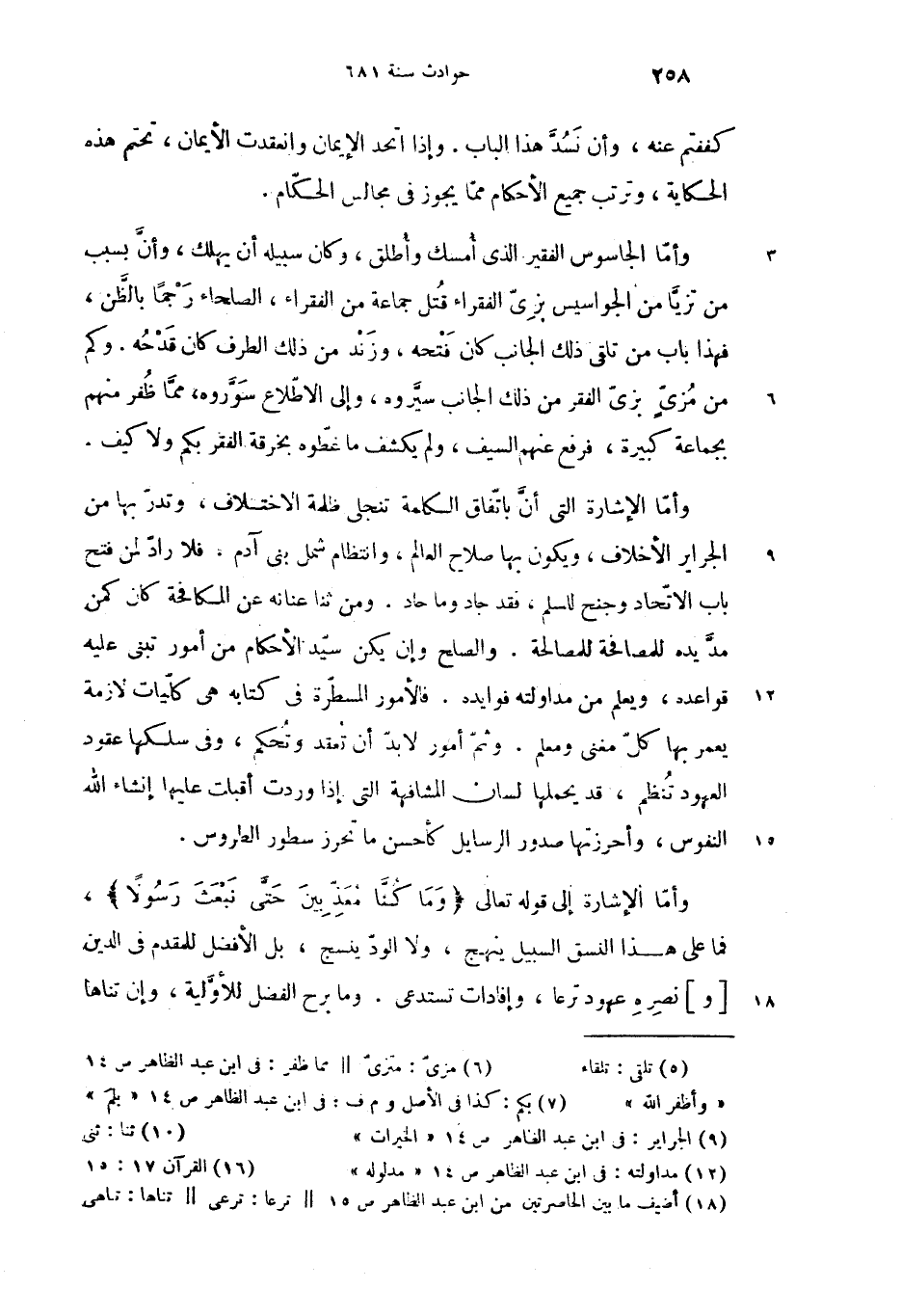 وأمّا الجاسوس الفقير الذى أمسك وأطلق، وكان سبيله أن يهلك، وأنّ بسبب من تزيّا من الجواسيس بزىّ الفقراء قتل جماعة من الفقراء، الصلحاء رجما بالظنّ، فهذا باب من تلقى (5) ذلك الجانب كان فتحه، وزند من ذلك الطرف كان قدحه. وكم من مزىّ (6) بزىّ الفقر من ذلك الجانب سيّروه، وإلى الاطّلاع سوّروه، ممّا ظفر منهم بجماعة كبيرة، فرفع عنهم السيف، ولم يكشف ما غطّوه بخرقة الفقر بكم (7) ولا كيف.