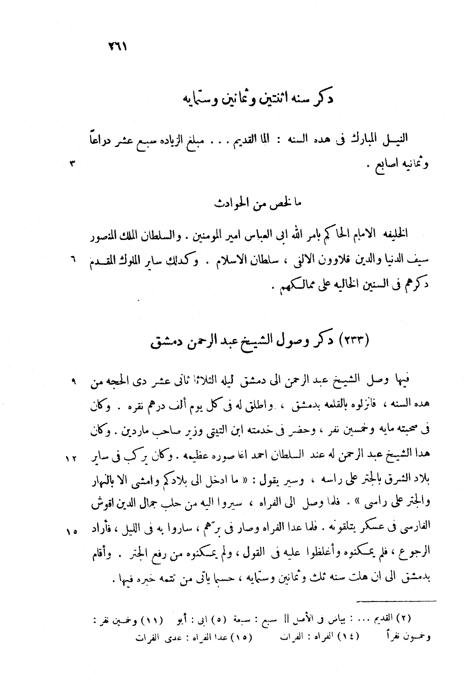 فيها وصل الشيخ عبد الرحمن الى دمشق ليله الثلاثا ثانى عشر دى الحجه من هده السنه، فانزلوه بالقلعه بدمشق، واطلق له فى كل يوم ألف درهم نقره. وكان فى صحبته مايه وخمسين نفر (11)، وحضر فى خدمته ابن التيتى وزير صاحب ماردين. وكان هدا الشيخ عبد الرحمن له عند السلطان احمد اغا صوره عظيمه. وكان يركب فى ساير بلاد الشرق بالجتر على راسه، وسير يقول: «ما ادخل الى بلادكم وامشى الا بالنهار واجتر على راسى». فلما وصل الى الفراه (14)، سيروا اليه من حلب جمال الدين اقوش الفارسى فى عسكر يتلقونه. فلما عدا الفراه (15) وصار فى برّهم، ساروا به فى الليل، فأراد الرجوع، فلم يمكنوه وأغلظوا عليه فى القول، ولم يمكنوه من رفع الجتر. وأقام بدمشق الى ان هلت سنه ثلث وثمانين وستمايه، حسبما ياتى من تتمه خبره فيها.