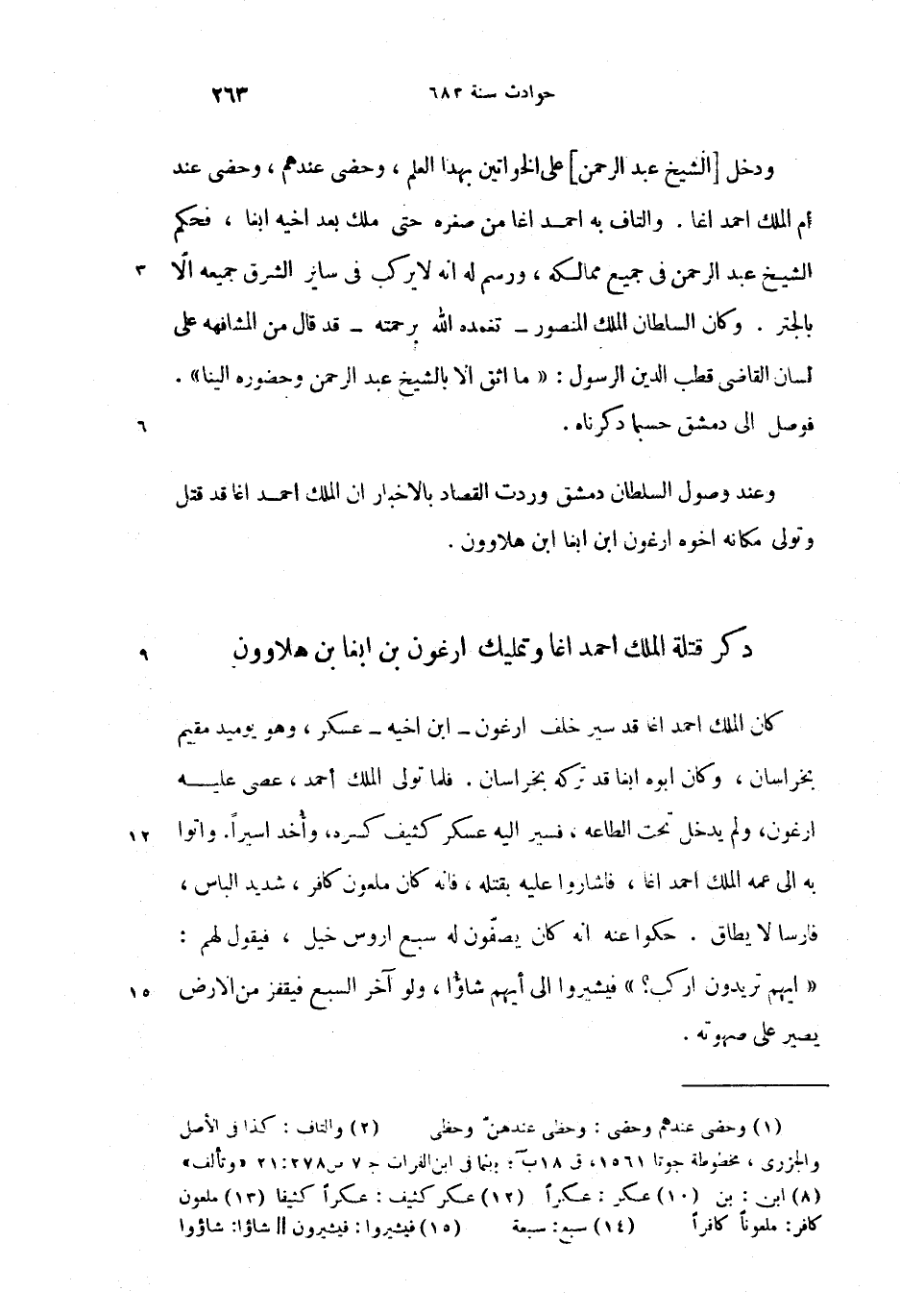 كان الملك احمد اغا قد سير خلف ارغون-ابن اخيه-عسكر (10)، وهو يوميد مقيم بخراسان، وكان ابوه ابغا قد تركه بخراسان. فلما تولى الملك أحمد، عصى عليه ارغون، ولم يدخل تحت الطاعه، فسير اليه عسكر كثيف (12) كسره، وأخد اسيرا. واتوا به الى عمه الملك احمد اغا، فاشاروا عليه بقتله، فانه كان ملعون كافر (13)، شديد الباس، فارسا لا يطاق. حكوا عنه انه كان يصفّون له سبع (14) اروس خيل، فيقول لهم: