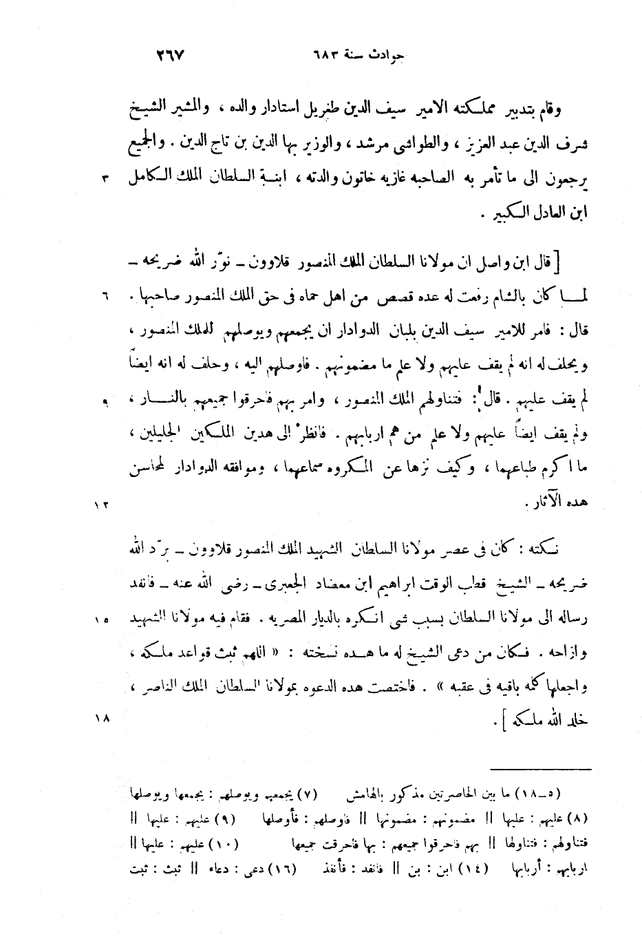 نكته: كان فى عصر مولانا السلطان الشهيد الملك المنصور قلاوون-برّد الله ضريحه-الشيخ قطب الوقت ابراهيم ابن (10) معضاد الجعبرى-رضى الله عنه-فانفد رساله الى مولانا السلطان بسبب شى انكره بالديار المصريه. فقام فيه مولانا الشهيد وازاحه. فكان من دعى (14) الشيخ له ما هده نسخته: «اللهم ثبت قواعد ملكه، واجعلها كلمه باقيه فى عقبه». فاختصت هده الدعوه بمولانا السلطان الملك الناصر، خلد الله ملكه] (16) (18).