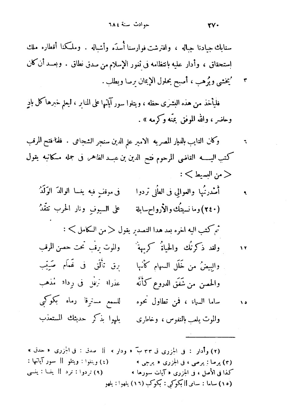وكان النايب بالديار المصريه الامير علم الدين سنجر الشجاعى. فلما فتح المرقب كتب اليه القاضى المرحوم فتح الدين بن عبد الظاهر فى جمله مكاتبه يقول <من البسيط>: