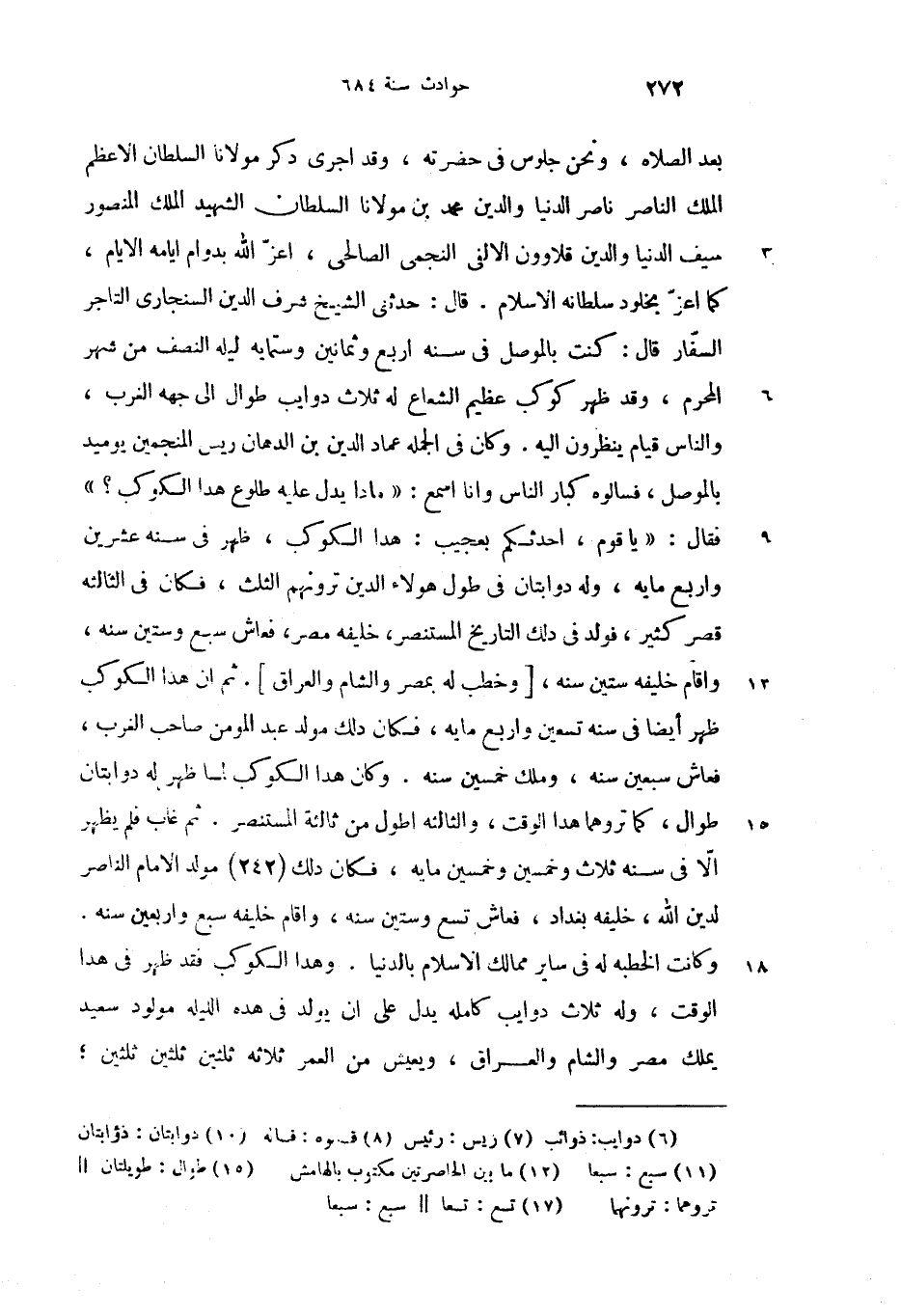 بعد الصلاه، ونحن جلوس فى حضرته، وقد اجرى ذكر مولانا السلطان الاعظم الملك الناصر ناصر الدنيا والدين محمد بن مولانا السلطان الشهيد الملك المنصور سيف الدنيا والدين قلاوون الالفى النجمى الصالحى، اعزّ الله بدوام ايامه الايام، كما اعزّ بخلود سلطانه الاسلام. قال: حدثنى الشيخ شرف الدين السنجارى التاجر السفّار قال: كنت بالموصل فى سنه اربع وثمانين وستمايه ليله النصف من شهر المحرم، وقد ظهر كوكب عظيم الشعاع له ثلاث دوايب (6) طوال الى جهه الغرب، والناس قيام ينظرون اليه. وكان فى الجمله عماد الدين بن الدهان ريس (7) المنجمين يوميد بالموصل، فسالوه (8) كبار الناس وانا اسمع: «مادا يدل عليه طلوع هدا الكوكب؟» فقال: «يا قوم، احدثكم بعجيب: هدا الكوكب، ظهر فى سنه عشرين واربع مايه، وله دوابتان (10) فى طول هولاء الدين ترونهم الثلث، فكان فى الثالثه قصر كثير، فولد فى دلك التاريخ المستنصر، خليفه مصر، فعاش سبع (11) وستين سنه، واقام خليفه ستين سنه، [وخطب له بمصر والشام والعراق] (12). ثم ان هدا الكوكب ظهر أيضا فى سنه تسعين واربع مايه، فكان دلك مولد عبد المومن صاحب الغرب، فعاش سبعين سنه، وملك خمسين سنه. وكان هدا الكوكب لما ظهر له دوابتان طوال (15)، كما تروهما هدا الوقت، والثالثه اطول من ثالثة المستنصر. ثم غاب فلم يظهر الاّ فى سنه ثلاث وخمسين وخمسين مايه، فكان دلك (242) مولد الامام الناصر لدين الله، خليفه بغداد، فعاش تسع (17) وستين سنه، واقام خليفه سبع واربعين سنه.