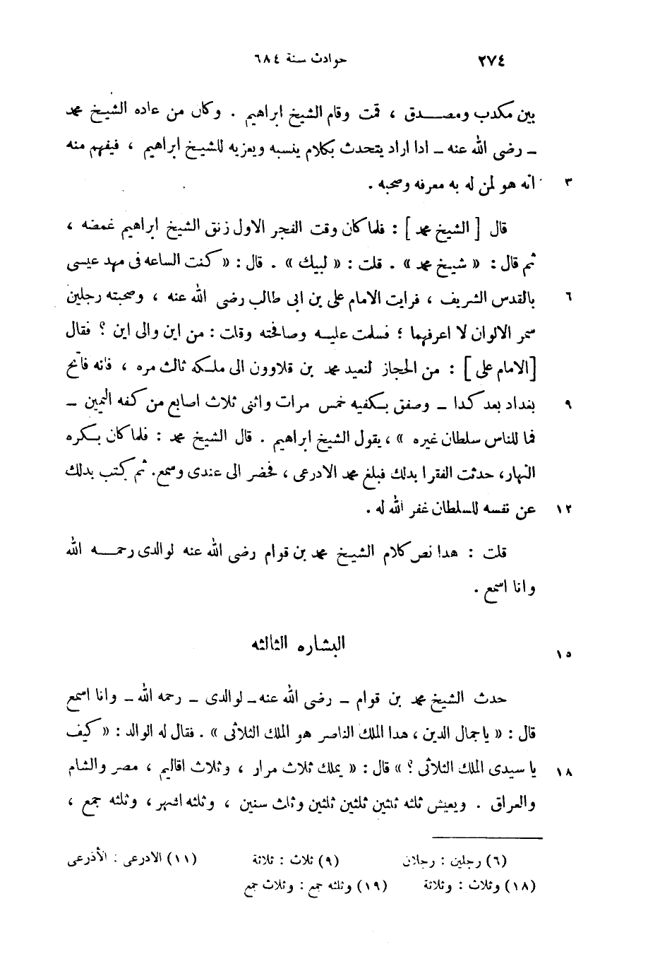 قال [الشيخ محمد]: فلما كان وقت الفجر الاول زنق الشيخ ابراهيم غمضه، ثم قال: «شيخ محمد». قلت: «لبيك». قال: «كنت الساعه فى مهد عيسى بالقدس الشريف، فرايت الامام على بن ابى طالب رضى الله عنه، وصحبته رجلين (6) سمر الالوان لا اعرفهما؛ فسلمت عليه وصافحته وقلت: من اين والى اين؟ فقال [الامام على]: من الحجاز لنعيد محمد بن قلاوون الى ملكه ثالث مره، فانه فاتح بغداد بعد كدا-وصفق بكفيه خمس مرات واثنى ثلاث (9) اصابع من كفه اليمين- فما للناس سلطان غيره»، يقول الشيخ ابراهيم. قال الشيخ محمد: فلما كان بكره النهار، حدثت الفقرا بدلك فبلغ محمد الادرعى (11)، فحضر الى عندى وسمع. ثم كتب بدلك عن نفسه للسلطان غفر الله له.