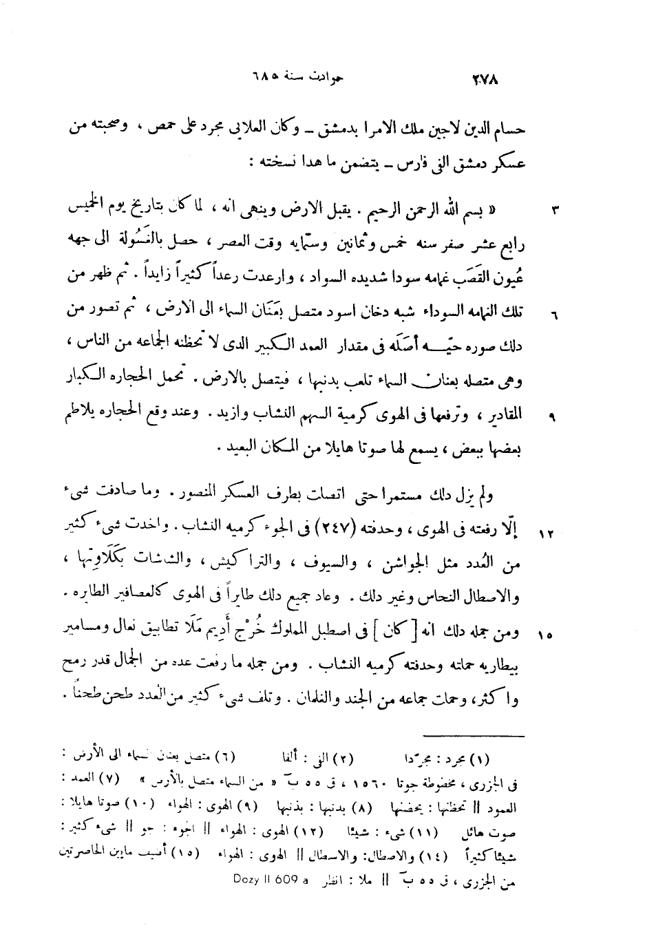 «بسم الله الرحمن الرحيم. يقبل الارض وينهى انه، لما كان بتاريخ يوم الخميس رابع عشر صفر سنه خمس وثمانين وستمايه وقت العصر، حصل بالغسولة الى جهه عيون القصب غمامه سودا شديده السواد، وارعدت رعدا كثيرا زايدا. ثم ظهر من تلك الغمامه السوداء شبه دخان اسود متصل بعنان السماء الى الارض (6)، ثم تصور من دلك صوره حيّه أصله فى مقدار العمد (7) الكبير الدى لا تحظنه الجماعه من الناس، وهى متصله بعنان السماء تلعب بدنبها (8)، فيتصل بالارض. تحمل الحجاره الكبار المقادير، وترفعها فى الهوى (9) كرمية السهم النشاب وازيد. وعند وقع الحجاره يلاطم بعضها ببعض، يسمع لها صوتا (10) هايلا من المكان البعيد.