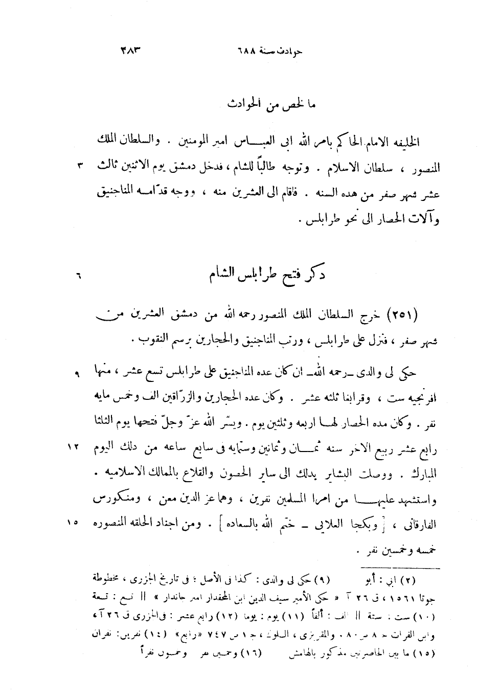 (251) خرج السلطان الملك المنصور رحمه الله من دمشق العشرين من شهر صفر، فنزل على طرابلس، ورتب المناجنيق والحجارين برسم النقوب.