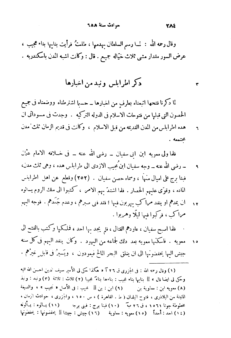 فلما ولى معويه (8) ابن ابى سفيان-رضى الله عنه-فى خلافه الامام عثمان -رضى الله عنه-وجه سفيان ابن (9) مجيب الازدى الى طرابلس هده، وهى ثلث مدن، فبنا برج (10) على اميال منها، وسماه حصن سفيان. (252) وقطع عن اهل اطرابلس الماده، وقوّى عليهم الحصار. فلما اشتدّ بهم الامر، كتبوا الى ملك الروم يسالوه (11) ان يمدهم او ينفد مراكب يهربون فيها؛ فقد فنى صبرهم، وعدم جلدهم. فوجه اليهم مراكب، فركبوا فيها ليلا وهربوا.