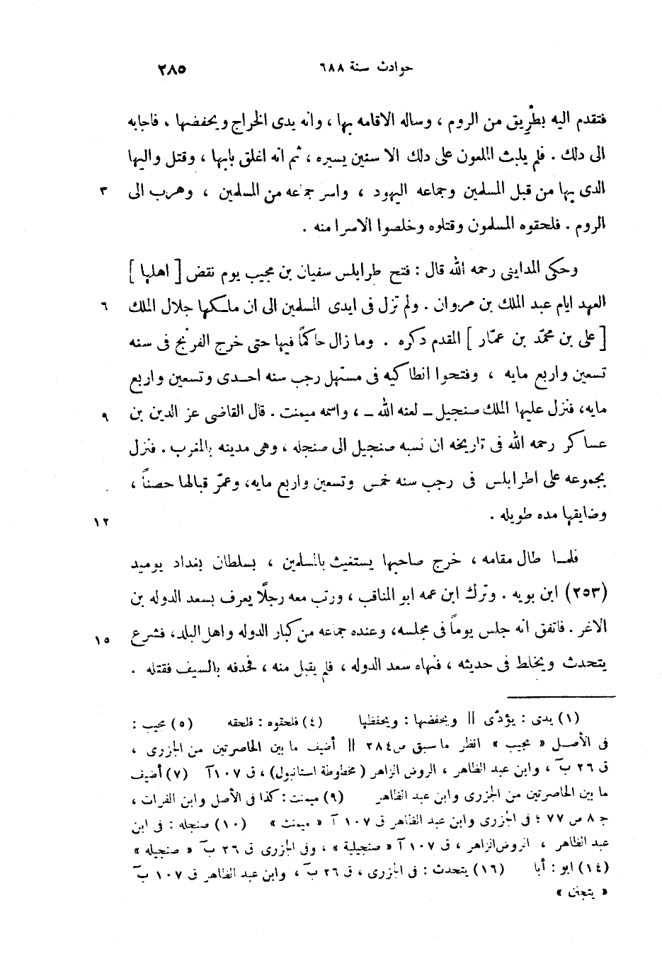 فلما طال مقامه، خرج صاحبها يستغيث بالمسلمين، بسلطان بغداد يوميد (253) ابن بويه. وترك ابن عمه ابو (14) المناقب، ورتب معه رجلا يعرف بسعد الدوله بن الاغر. فاتفق انه جلس يوما فى مجلسه، وعنده جماعه من كبار الدوله واهل البلد، فشرع يتحدث (16) ويخلط فى حديثه، فنهاه سعد الدوله، فلم يقبل منه، فحذفه بالسيف فقتله.