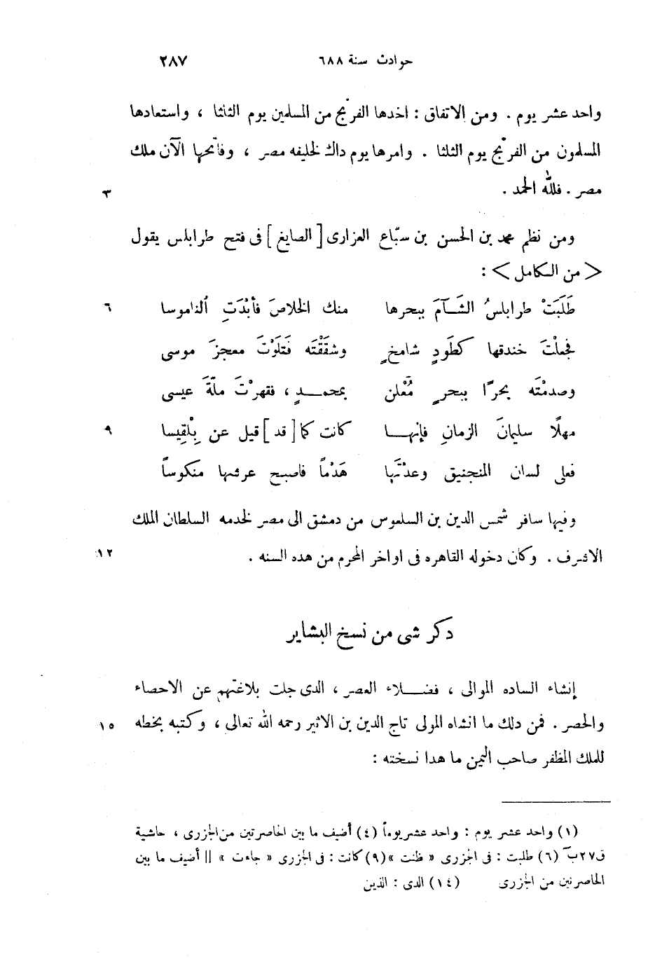 ومن نظم محمد بن الحسن بن سبّاع العزارى [الصايغ] (4) فى فتح طرابلس يقول <من الكامل>: