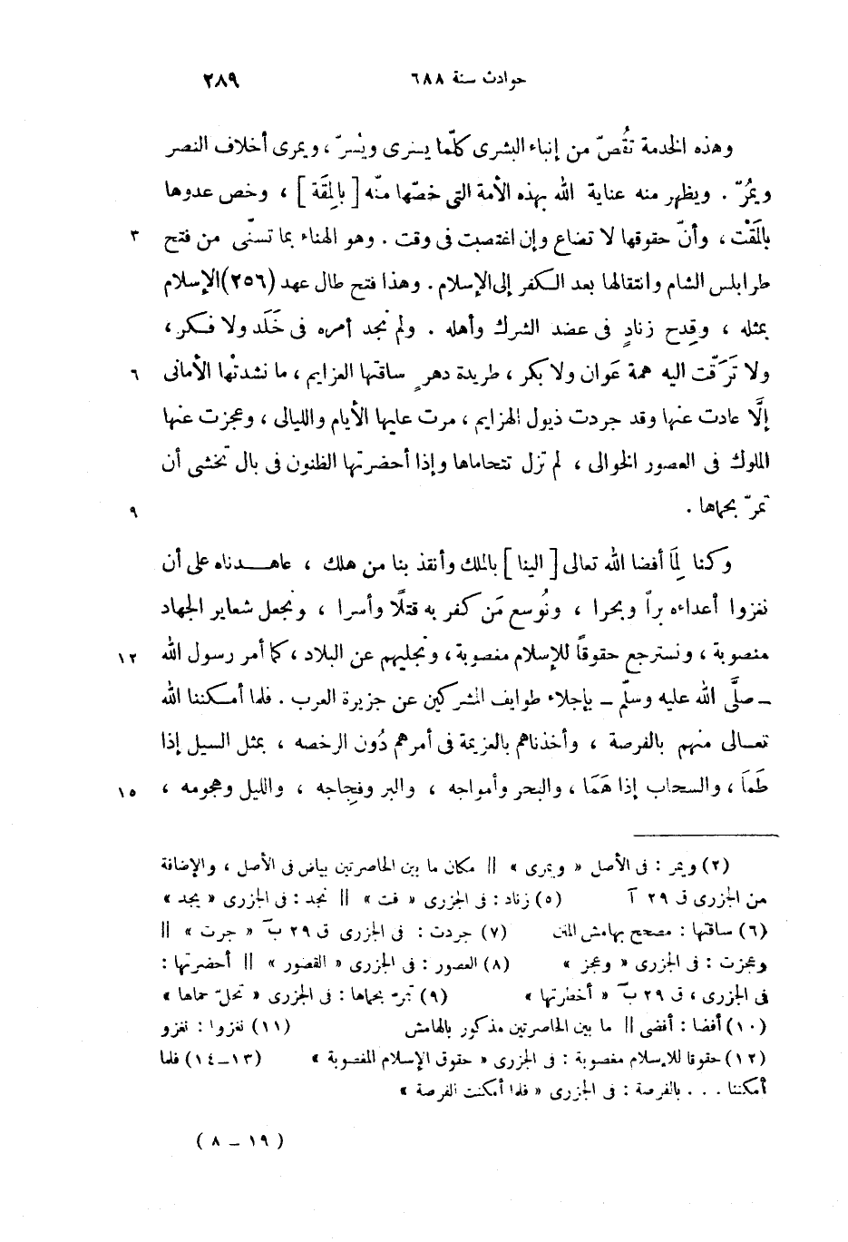 وكنا لما أفضا (10) الله تعالى [الينا] بالملك وأنقذ بنا من هلك، عاهدناه على أن نغزوا (11) أعداءه برا وبحرا، ونوسع من كفر به قتلا وأسرا، ونجعل شعاير الجهاد منصوبة، ونسترجع حقوقا للإسلام مغصوبة (12)، ونجليهم عن البلاد، كما أمر رسول الله -صلّى الله عليه وسلّم-بإجلاء طوايف المشركين عن جزيرة العرب. فلما (13) أمكننا الله تعالى منهم بالفرصة (14)، وأخذناهم بالعزيمة فى أمرهم دون الرخصه، بمثل السيل إذا طما، والسحاب إذا هما، والبحر وأمواجه، والبر وفجاجه، والليل وهجومه،