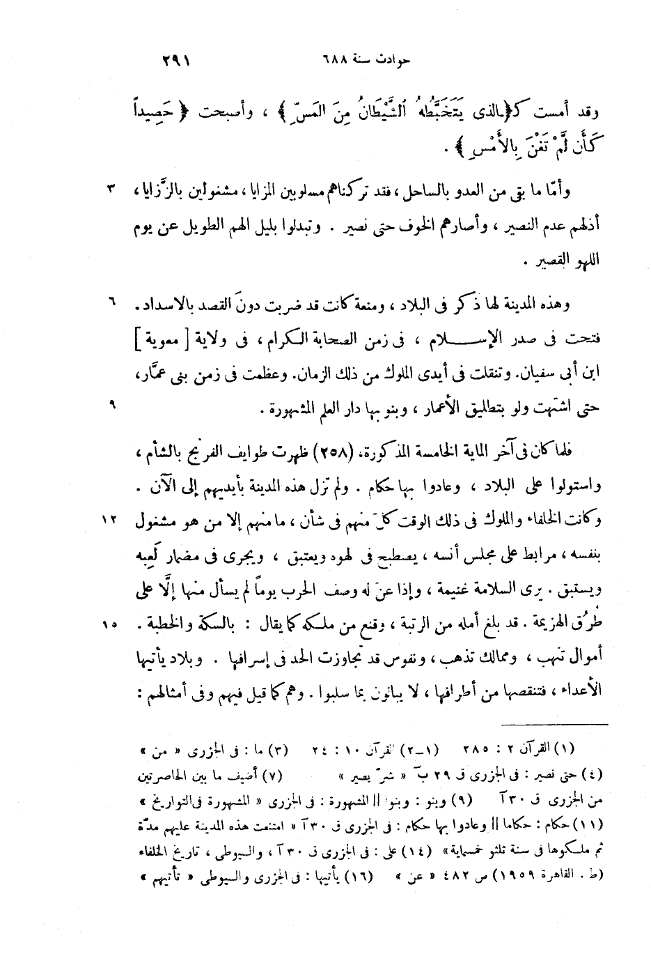 فلما كان فى آخر الماية الخامسة المذكورة، (258) ظهرت طوايف الفرنج بالشأم، واستولوا على البلاد، وعادوا بها حكام (11). ولم تزل هذه المدينة بأيديهم إلى الآن.