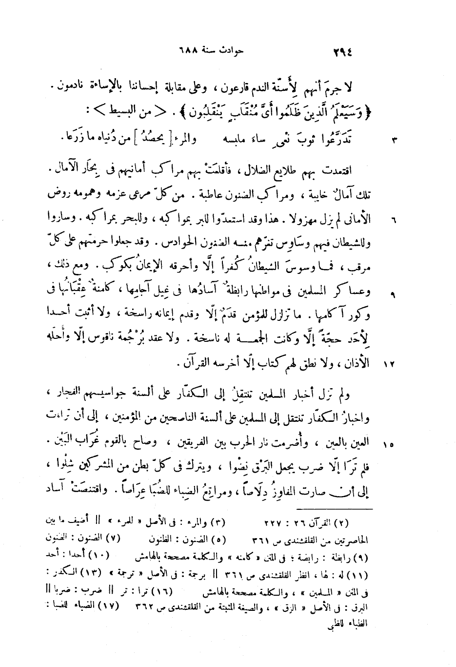 تلك آمال خايبة، ومراكب الضنون (5) عاطبة. من كلّ مرعى عزمه وهمومه روض الأمانى لم يزل مهزولا. هذا وقد استعدّوا للبر بمواكبه، وللبحر بمراكبه. وساروا وللشيطان فيهم وساوس تغرّهم منه الضنون (7) الحوادس. وقد جعلوا حرمتهم على كلّ مرقب، فما وسوس الشيطان كفرا إلاّ وأحرقه الإيمان بكوكب. ومع ذلك، وعساكر المسلمين فى مواطنها رابظة (9) آسادها فى غيل آجامها، كامنة عقبانها فى وكور آكامها. وما تزلزل لمؤمن قدم إلاّ وقدم إيمانه راسخة، ولا أثبت أحدا (10) لأحد حجّة إلاّ وكانت الجمعة له (11) ناسخة. ولا عقد برجمه ناقوس إلاّ وأحلّه الأذان، ولا نطق لهم كتاب إلاّ أخرسه القرآن.