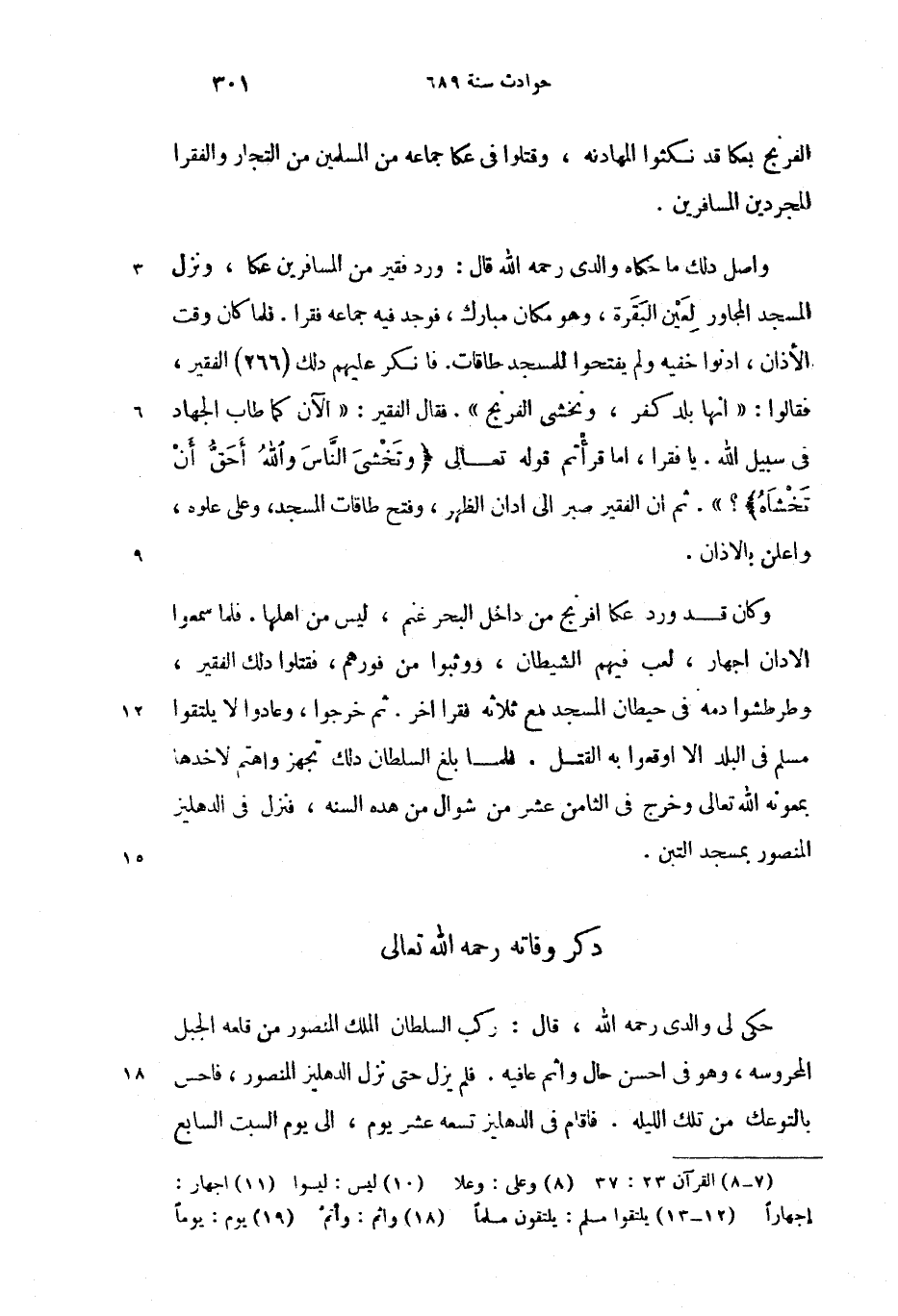 حكى لى والدى رحمه الله، قال: ركب السلطان الملك المنصور من قلعه الجبل المحروسه، وهو فى احسن حال واثم (18) عافيه. فلم يزل حتى نزل الدهليز المنصور، فاحس بالتوعك من تلك الليله. فاقام فى الدهليز تسعه عشر يوم (19)، الى يوم السبت السابع