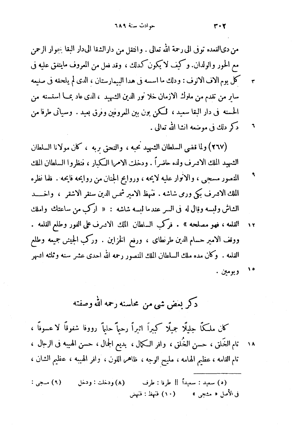 من دى القعده توفى الى رحمة الله تعالى. وانتقل من دار الشقا الى دار البقا بجوار الرحمن مع الحور والولدان. وكيف لا يكون كدلك، وقد فعل من المعروف ما ينفق عليه فى كل يوم الاف الالوف: ودلك ما اسسه فى هدا البيمارستان، الدى لم يلحقه فى صنيعه ساير من تقدم من ملوك الازمان خلا نور الدين الشهيد، الدى عاد بما استسنه من الحسنه فى دار البقا سعيد (5)، لكن بون بين المعروفين وفرق بعيد. وسياتى طرفا من دكر دلك فى موضعه انشا الله تعالى.
