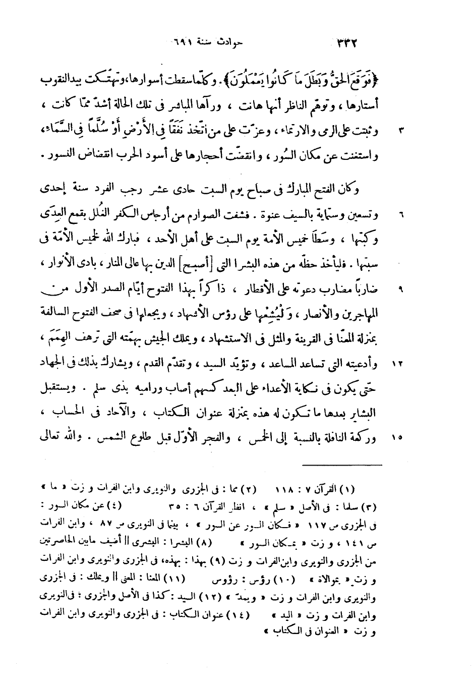 وكان الفتح المبارك فى صباح يوم السبت حادى عشر رجب الفرد سنة إحدى وتسعين وستماية بالسيف عنوة. فشفت الصوارم من أرجاس الكفر الغلل بقمع العدى وكبتها، وسطا خميس الأمة يوم السبت على أهل الأحد، فبارك الله لخميس الأمّة فى سبتها. فليأخذ حظّه من هذه البشرا (8) التى [أصبح] الدين بها عالى المنار، بادى الأنوار، ضاربا مضارب دعوته على الأقطار، ذاكرا بهذا (9) الفتوح أيّام الصدر الأول من المهاجرين والأنصار، وليشعها على رؤس (10) الأشهاد، ويجعلها فى صحف الفتوح السالفة بمنزلة المعنّا (11) فى القرينة والمثل فى الاستشهاد، ويملك الجيش بهمّته التى ترهف الهمم، وأدعيته التى تساعد المساعد، وتؤيّد السيد (12)، وتقدّم القدم، ويشارك بذلك فى الجهاد حتّى يكون فى نكاية الأعداء على البعد كسهم أصاب وراميه بذى سلم. ويستقبل البشاير بعدها ما تكون له هذه بمنزلة عنوان الكتاب (14)، والآحاد فى الحساب، وركعة النافلة بالنسبة إلى الخمس، والفجر الأوّل قبل طلوع الشمس. والله تعالى