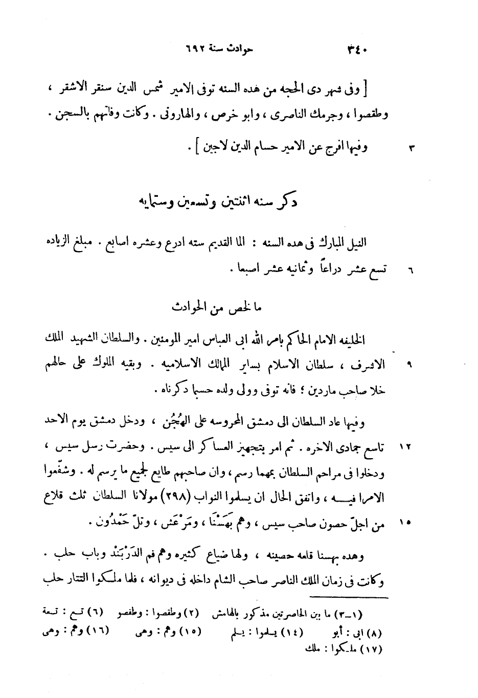 الخليفه الامام الحاكم بامر الله ابى (8) العباس امير المومنين. والسلطان الشهيد الملك الاشرف، سلطان الاسلام بساير الممالك الاسلاميه. وبقيه الملوك على حالهم خلا صاحب ماردين؛ فانه توفى وولى ولده حسبما دكرناه.