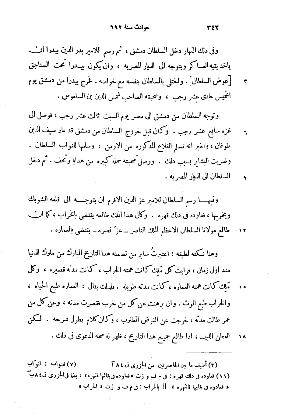 وهنا نكته لطيفه: اعتبرت ساير من تضمنه هدا التاريخ المبارك من ملوك الدنيا مند اول زمان، فرايت كل ملك كانت همته الخراب، كانت مدته قصيره، وكل ملك كانت همته العماره، كانت مدته طويله. فلدلك يقال: العماره طبع الحياه، والخراب طبع الموت. وان برهنت عن كل من خرب فقصرت مدته، وعن كل من عمر طالت مدته، خرجت عن الغرض المطلوب، وكان كلام يطول شرحه. لكن الفطن اللبيب، ادا طالع جميع هدا التاريخ، ظهر له صحه الدعوى فى دلك.