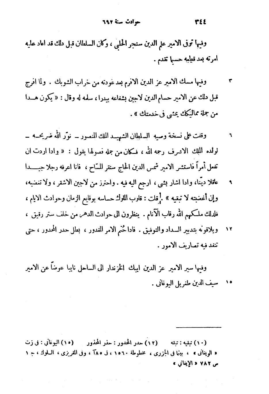 وقفت على نسخة وصيه السلطان الشهيد الملك المنصور-نوّر الله ضريحه- لولده الملك الاشرف رحمه الله، فكان من جمله فصولها يقول: «واذا اردت ان تفعل أمرا فاستشر الامير شمس الدين الحاج سنقر المسّاح، فانا اعرفه رجلا جيدا عاقلا ديّنا، واذا اشار بشى، ارجع اليه فيه. واحترز من لاجين الاشقر، ولا تغضبه، وإن أغضبته لا تبقيه (10)». قلت: قلوب الملوك حساسه بوقايع الزمان وحوادث الايام، فلدلك ملكهم الله رقاب الآنام. ينظرون الى حوادث الدهر من خلف ستر رقيق، ويلاقونه بتدبير السداد والتوفيق. فادا حتم الامر المقدور، بطل حدر المحدور (12)، حتى تنفد فيه تصاريف الامور.