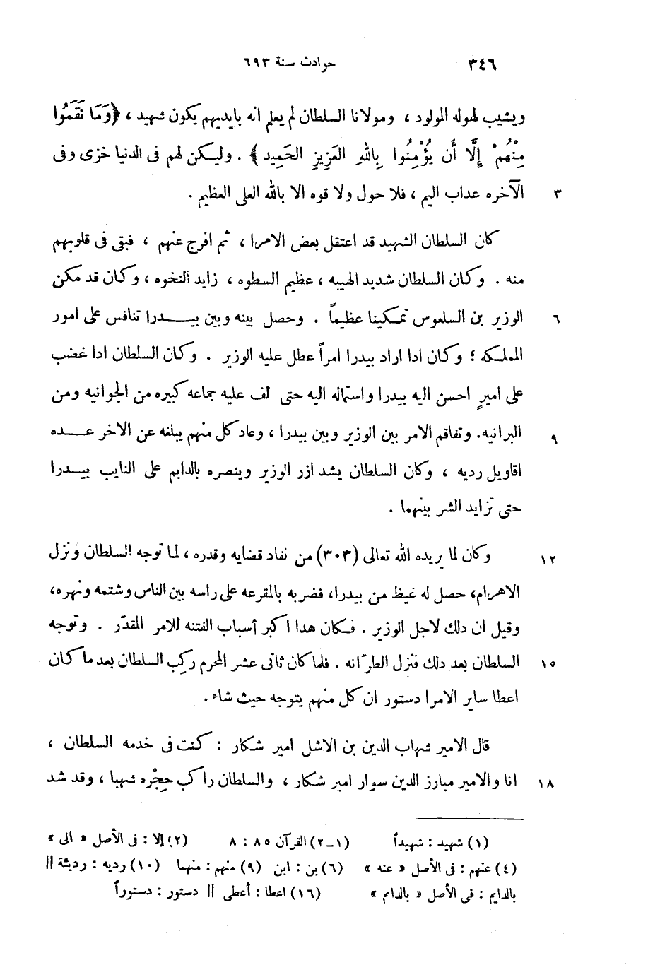 كان السلطان الشهيد قد اعتقل بعض الامرا، ثم افرج عنهم (4)، فبقى فى قلوبهم منه. وكان السلطان شديد الهيبه، عظيم السطوه، زايد النخوه، وكان قد مكن الوزير بن (6) السلعوس تمكينا عظيما. وحصل بينه وبين بيدرا تنافس على امور المملكه؛ وكان ادا اراد بيدرا امرا عطل عليه الوزير. وكان السلطان ادا غضب على امير احسن اليه بيدرا واستماله اليه حتى لف عليه جماعه كبيره من الجوانيه ومن البرانيه. وتفاقم الامر بين الوزير وبين بيدرا، وعاد كل منهم (9) يبلغه عن الاخر عده اقاويل رديه (10)، وكان السلطان يشد ازر الوزير وينصره بالدايم على النايب بيدرا حتى تزايد الشر بينهما.