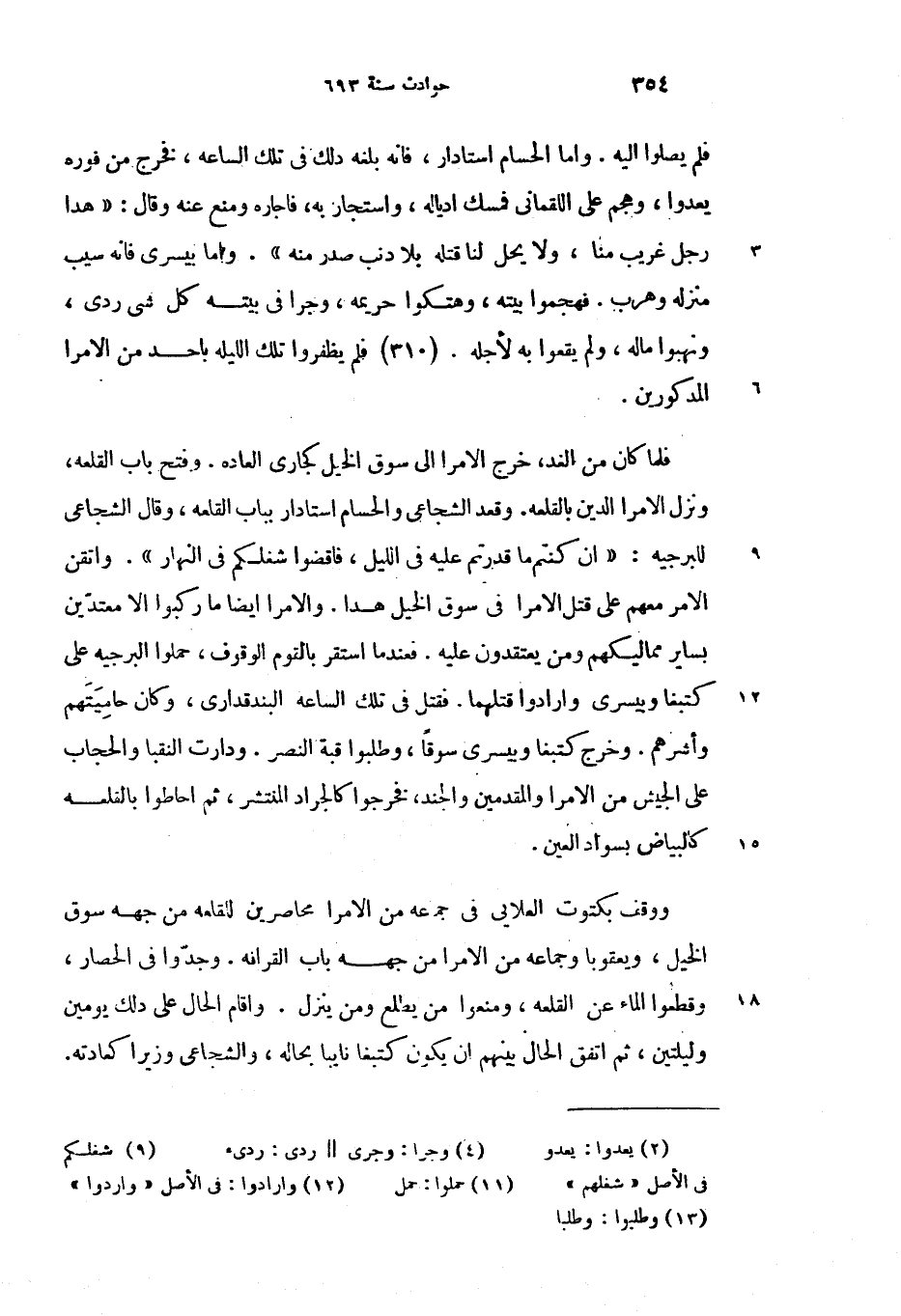 فلم يصلوا اليه. واما الحسام استادار، فانه بلغه دلك فى تلك الساعه، فخرج من فوره يعدوا (2)، وهجم على اللقمانى فمسك ادياله، واستجار به، فاجاره ومنع عنه وقال: «هدا رجل غريب منا، ولا يحل لنا قتله بلا ذنب صدر منه». واما بيسرى فانه سيب منزله وهرب. فهجموا بيته، وهتكوا حريمه، وجرا (4) فى بيته كل شى ردى، ونهبوا ماله، ولم يقعوا به لأجله. (310) فلم يظفروا تلك الليله باحد من الامرا المدكورين.