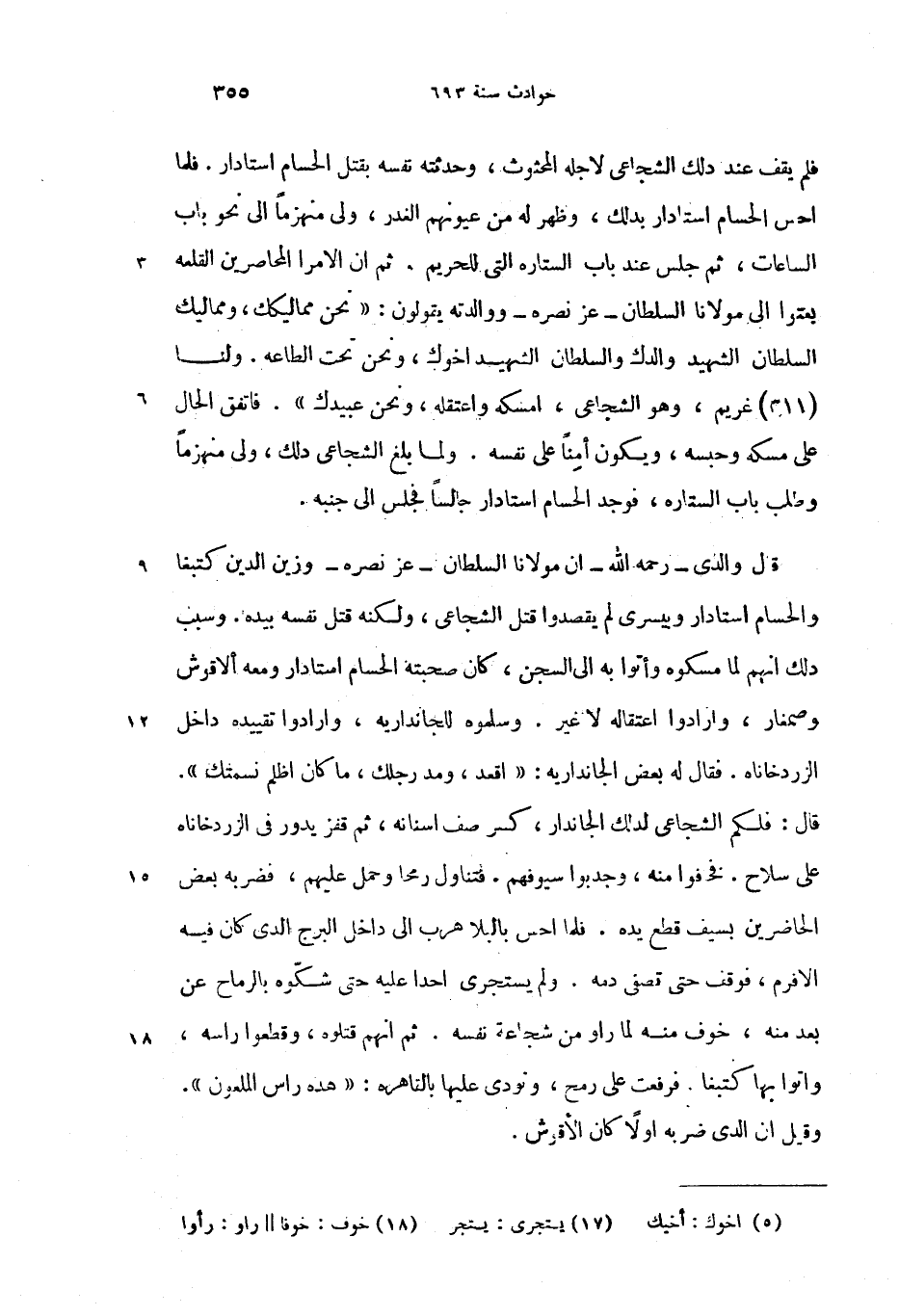 فلم يقف عند دلك الشجاعى لاجله المحثوث، وحدثته نفسه بقتل الحسام استادار. فلما احس الحسام استادار بدلك، وظهر له من عيونهم الغدر، ولى منهزما الى نحو باب الساعات، ثم جلس عند باب الستاره التى للحريم. ثم ان الامرا المحاصرين القلعه بعثوا الى مولانا السلطان-عز نصره-ووالدته يقولون: «نحن مماليكك، ومماليك السلطان الشهيد والدك والسلطان الشهيد اخوك (5)، ونحن تحت الطاعه. ولنا (311) غريم، وهو الشجاعى، امسكه واعتقله، ونحن عبيدك». فاتفق الحال على مسكه وحبسه، ويكون أمنا على نفسه. ولما بلغ الشجاعى دلك، ولى منهزما وطلب باب الستاره، فوجد الحسام استادار جالسا فجلس الى جنبه.
