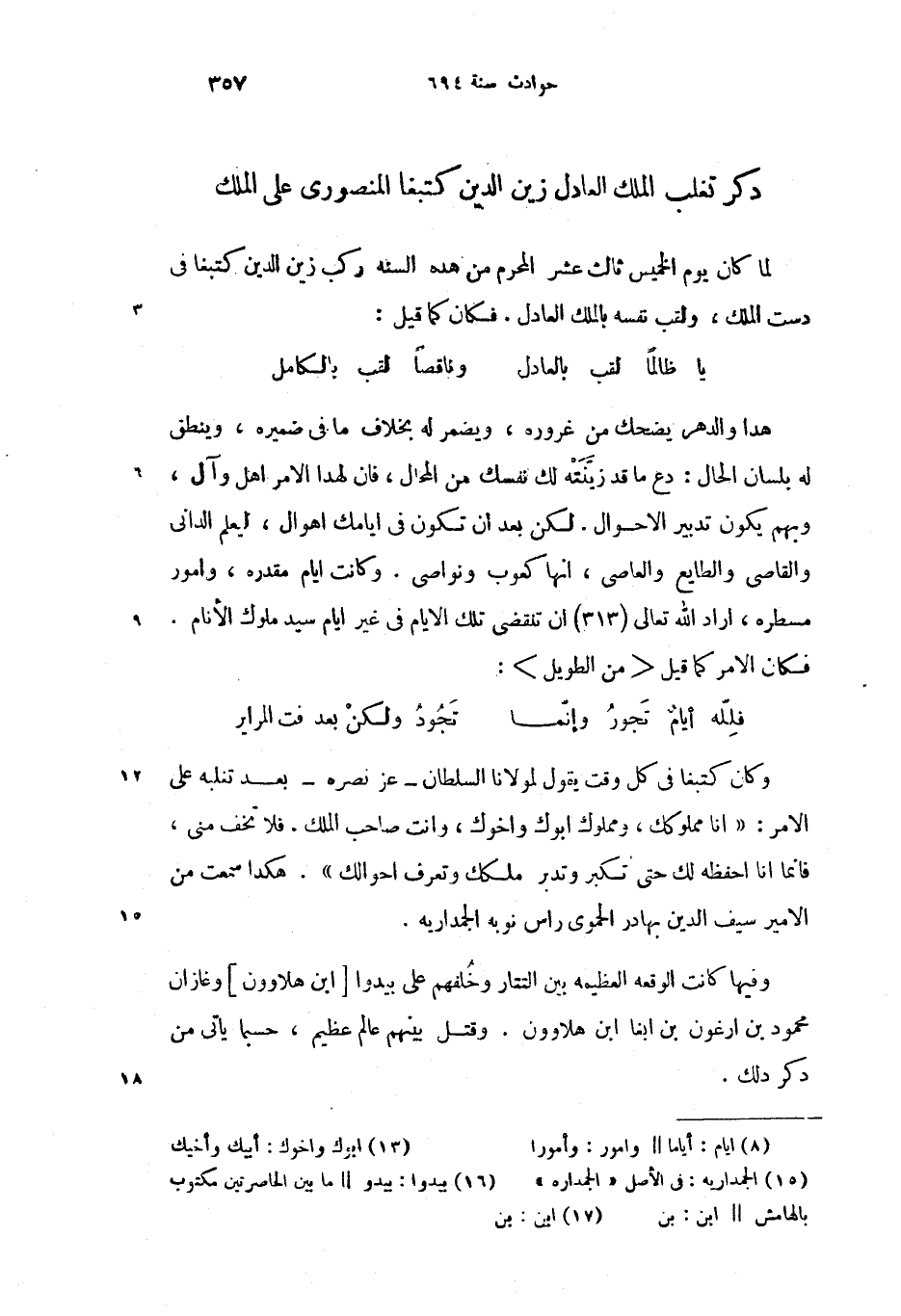 هدا والدهر يضحك من غروره، ويضمر له بخلاف ما فى ضميره، وينطق له بلسان الحال: دع ما قد زيّنته لك نفسك من المحال، فان لهدا الامر اهل وآل، وبهم يكون تدبير الاحوال. لكن بعد أن تكون فى ايامك اهوال، ليعلم الدانى والقاصى والطايع والعاصى، انها كعوب ونواصى. وكانت ايام (8) مقدره، وامور مسطره، اراد الله تعالى (313) ان تنقضى تلك الايام فى غير ايام سيد ملوك الأنام.