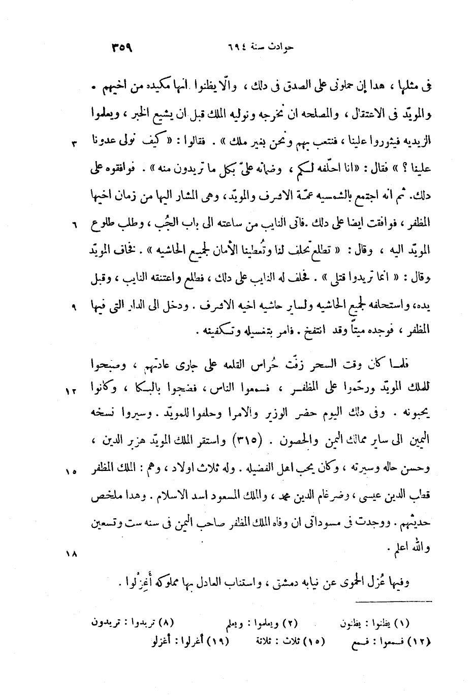 فلما كان وقت السحر زفّت حراس القلعه على جارى عادتهم، وصبحوا للملك المويّد ورحّموا على المظفر، فسمعوا (12) الناس، فضجوا بالبكا، وكانوا يحبونه. وفى دلك اليوم حضر الوزير والامرا وحلفوا للمويّد. وسيروا نسخه اليمين الى ساير ممالك اليمن والحصون. (315) واستقر الملك المويّد هزبر الدين، وحسن حاله وسيرته، وكان يحب اهل الفضيله. وله ثلاث (15) اولاد، وهم: الملك المظفر قطب الدين عيسى، وضرغام الدين محمد، والملك المسعود اسد الاسلام. وهدا ملخص حديثهم. ووجدت فى مسوداتى ان وفاه الملك المظفر صاحب اليمن فى سنه ست وتسعين والله اعلم.