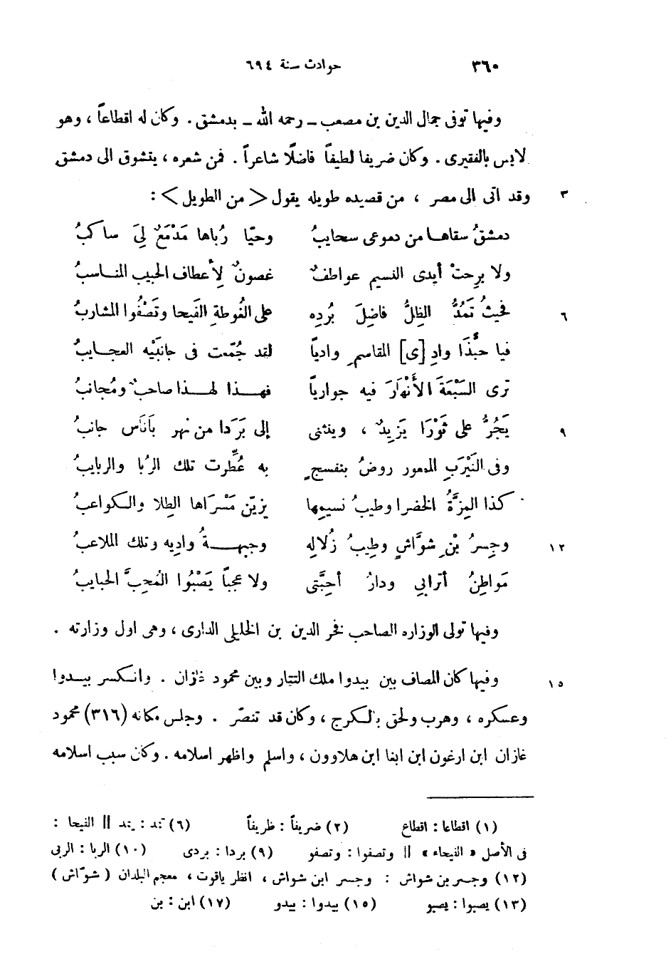 وفيها توفى جمال الدين بن مصعب-رحمه الله-بدمشق. وكان له اقطاعا (1)، وهو لابس بالفقيرى. وكان ضريفا (2) لطيفا فاضلا شاعرا. فمن شعره، يتشوق الى دمشق وقد اتى الى مصر، من قصيده طويله يقول <من الطويل>: