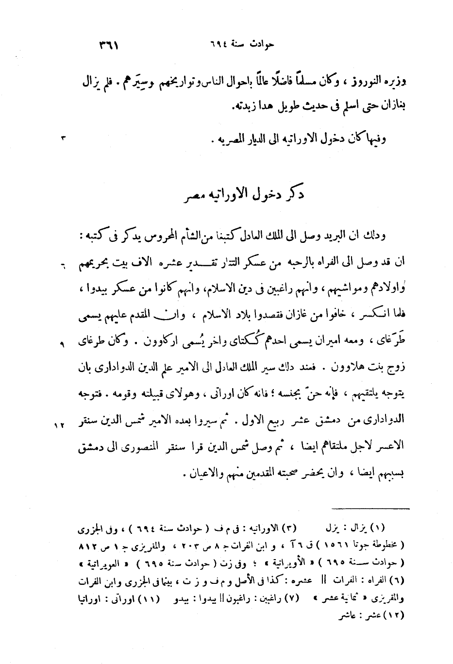 (3) الاورانيه: فى م ف (حوادث سنة 694)، وفى الجزرى (مخطوطة جوتا 1561) ق 6 آ، وابن الفرات ج 8 ص 203، والمقريزى ج 1 ص 812 (حوادث سنة 695) «الأويراتية»؛ وفى ز ت (حوادث سنة 695) «العويراتية»