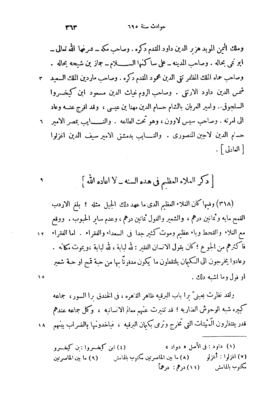 (318) وفيها كان الغلاء العظيم الدى ما عهد دلك الجيل مثله؛ بلغ الاردب القمح مايه وثمانين درهم، والشعير والفول ثمانين درهم (11)، وعدم ساير الحبوب. ووقع مع الغلاء والقحط وباء عظيم وموت كثير جدا فى السعداء والفقراء. اما الفقراء فاكثرهم من الجوع؛ كان يقول الانسان الفقير: لله لبابة، لله لبابة، ويموت مكانه.
