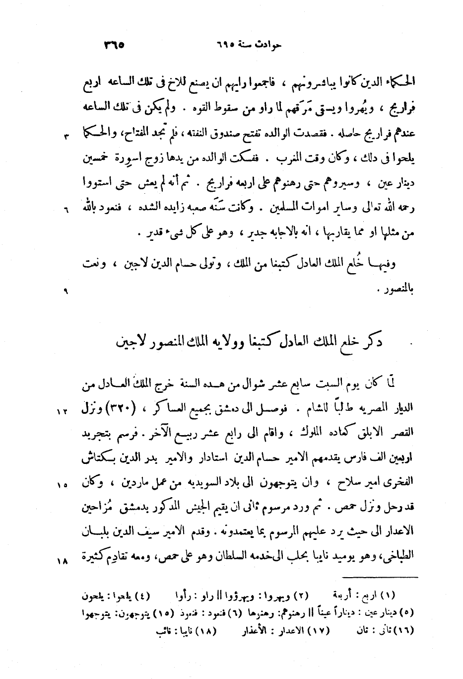 لمّا كان يوم السبت سابع عشر شوال من هده السنة خرج الملك العادل من الديار المصريه طالبا للشام. فوصل الى دمشق بجميع العساكر، (320) ونزل القصر الابلق كعاده الملوك، واقام الى رابع عشر ربيع الآخر. فرسم بتجريد اربعين الف فارس يقدمهم الامير حسام الدين استادار والامير بدر الدين بكتاش الفخرى امير سلاح، وان يتوجهون (15) الى بلاد السويديه من عمل ماردين، وكان قد رحل ونزل حمص. ثم ورد مرسوم ثانى (16) ان يقيم الجيش المدكور بدمشق مزاحين الاعدار (17) الى حيث يرد عليهم المرسوم بما يعتمدونه. وقدم الامير سيف الدين بلبان الطباخى، وهو يوميد نايبا (18) بحلب الى خدمه السلطان وهو على حمص، ومعه تقادم كثيرة