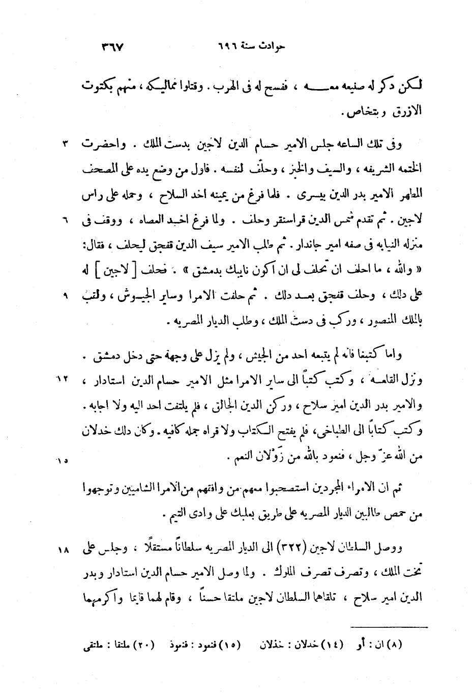 «والله، ما احلف ان (8) تحلف لى ان اكون نايبك بدمشق». فحلف [لاجين] له على دلك، وحلف قفجق بعد دلك. ثم حلفت الامرا وساير الجيوش، ولقب بالملك المنصور، وركب فى دست الملك، وطلب الديار المصريه.