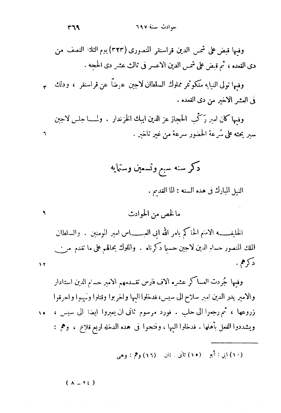 الخليفه الامام الحاكم بامر الله ابى (10) العباس امير المومنين. والسلطان الملك المنصور حسام الدين لاجين حسبما دكرناه. والملوك بحالهم على ما تقدم من دكرهم.