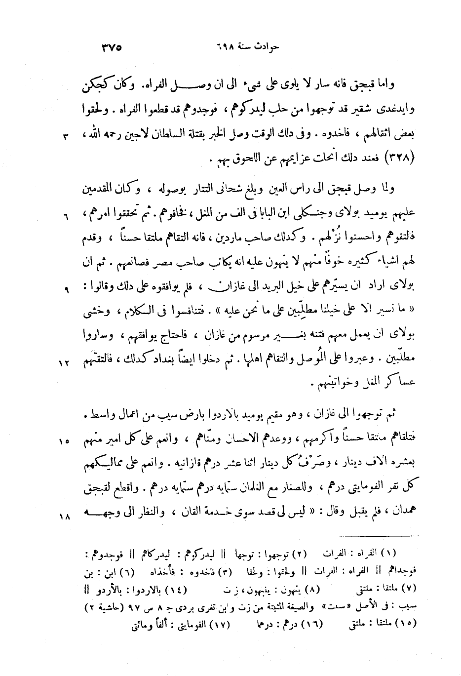 واما قبجق فانه سار لا يلوى على شئ الى ان وصل الفراه (1). وكان كجكن وايدغدى شقير قد توجهوا (2) من حلب ليدركوهم، فوجدوهم قد قطعوا الفراه. ولحقوا بعض اثقالهم، فاخدوه (3). وفى دلك الوقت وصل الخبر بقتلة السلطان لاجين رحمه الله، (328) فعند دلك انحلت عزايمهم عن اللحوق بهم.
