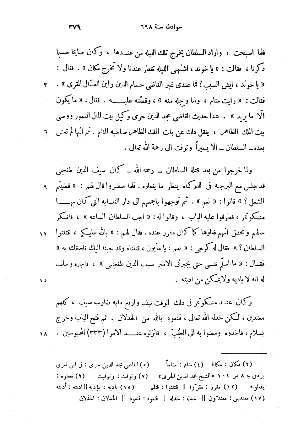 ولما خرجوا من بعد قتلة السلطان-رحمه الله-كان سيف الدين طغجى قد جلس مع البرجيه فى الدركاه ينظر ما يفعلوه (9). فلما حضروا قال لهم: «قضيتم الشغل؟» قالوا: «نعم». ثم توجهوا باجمعهم الى دار النيابه التى كان بها منكوتمر، فطرقوا عليه الباب، وقالوا له: «اجب السلطان الساعه»، فانكر حالهم وتحقق انهم فعلوها كما كان مقرر (12) عنده. فقال لهم: «بالله عليكم، قتلتوا السلطان؟» فقال له كرجى: «نعم، يا مأبون، قتلناه وقد جينا اليك نلحقك به» فقال: «ما اسلّم نفسى حتى يجيرنى الامير سيف الدين طغجى»، فاجاره وحلف له انه لا ياديه (15) ولا يمكن من اديته.