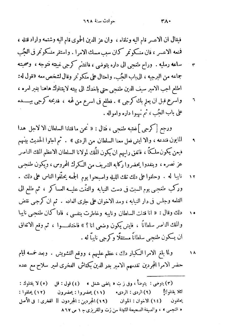 ورجع [كرجى] فعتبه طغجى، فقال: «نحن ما قتلنا السلطان الا لاجل هذا المابون فندعه، والا ايش فعل معنا السلطان من الردى (9)». ثم اجالوا الحديث بينهم فيمن يكون ملكا، فاتفق رايهم ان يكون الملك لمولانا السلطان الاعظم الملك الناصر عز نصره، وينفدوا يحضروا (11) ركابه الشريف من الكرك المحروس، ويكون طغجى نايبا له. وحلفوا على دلك تلك الليله واصبحوا يوم الجمعه يحلّفوا (12) الناس على دلك.