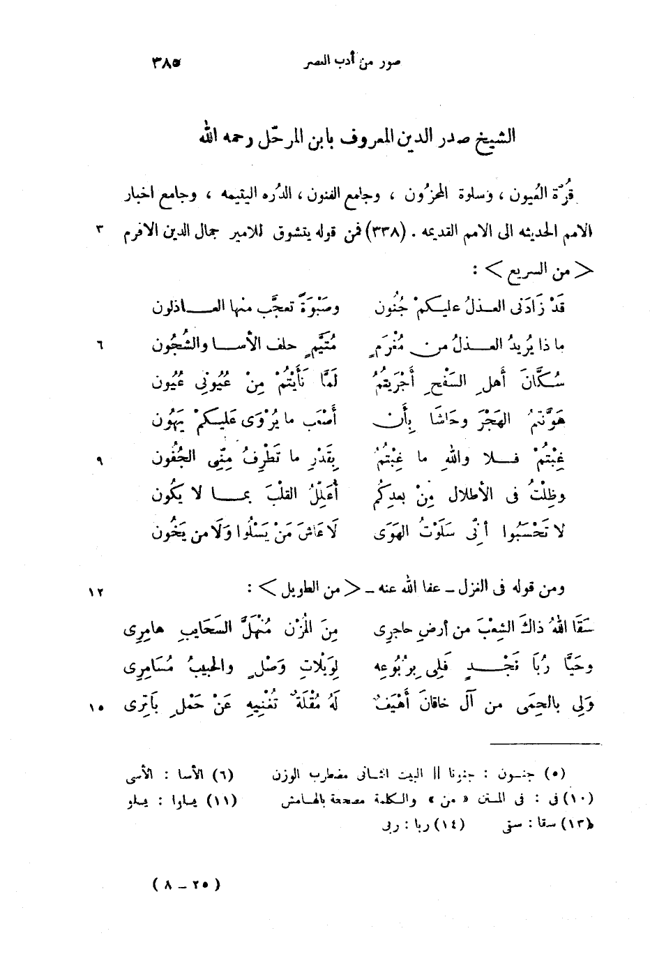 قرّة العيون، وسلوة المحزون، وجامع الفنون، الدره اليتيمه، وجامع اخبار الامم الحديثه الى الامم القديمه. (338) فمن قوله يتشوق للامير جمال الدين الافرم <من السريع>: