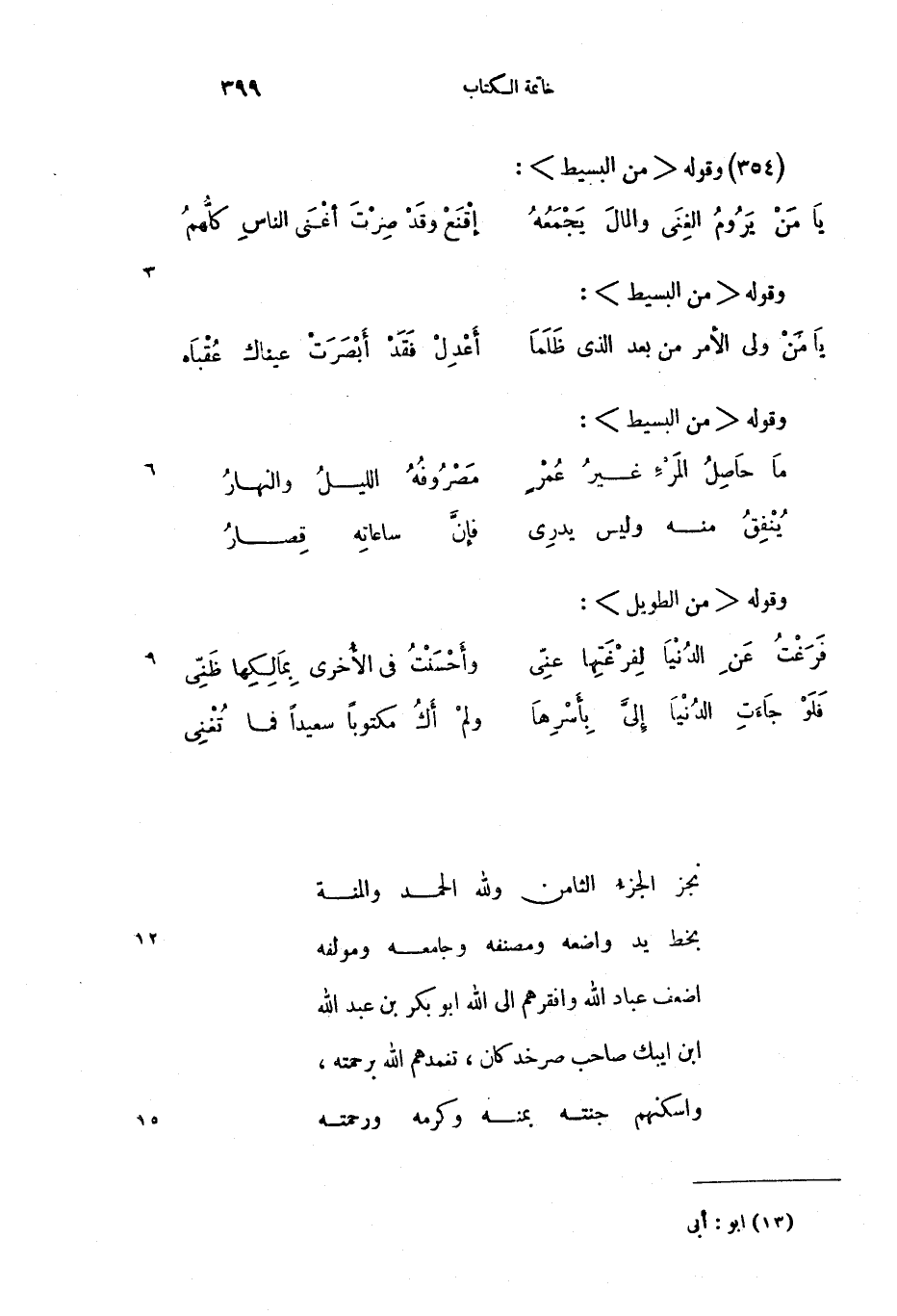 نجز الجزء الثامن ولله الحمد والمنة بخط يد واضعه ومصنفه وجامعه ومولفه اضعف عباد الله وافقرهم الى الله ابو (13) بكر بن عبد الله ابن ايبك صاحب صرخد كان، تغمدهم الله برحمته، واسكنهم جنته بمنه وكرمه ورحمته