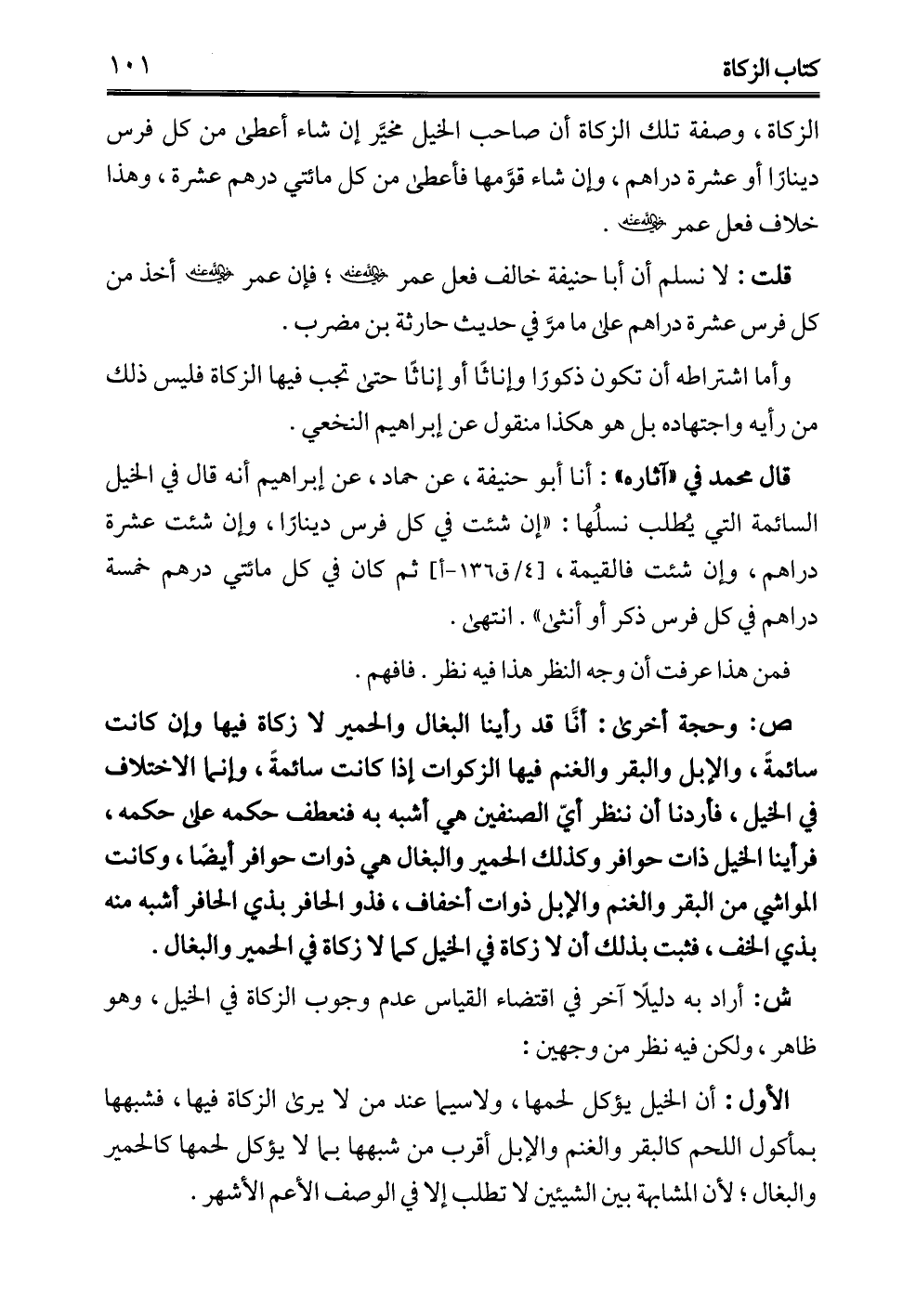 ص: وحجة أخرى: أنَّا قد رأينا البغال والحمير لا زكاة فيها وإن كانت سائمةً، والإبل والبقر والغنم فيها الزكوات إذا كانت سائمةً، وإنما الاختلاف في الخيل، فأردنا أن ننظر أيّ الصنفين هي أشبه به فنعطف حكمه على حكمه، فرأينا الخيل ذات حوافر وكذلك الحمير والبغال هي ذوات حوافر أيضًا، وكانت المواشي من البقر والغنم والإبل ذوات أخفاف، فذو الحافر بذي الحافر أشبه منه بذي الخف، فثبت بذلك أن لا زكاة في الخيل كما لا زكاة في الحمير والبغال.
