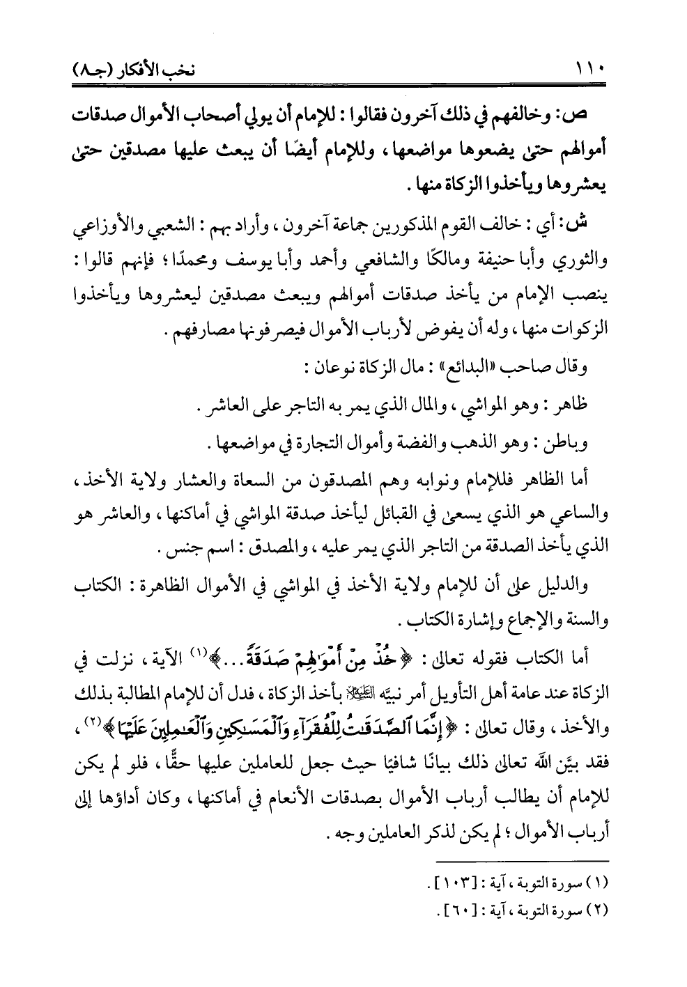 ش: أي: خالف القوم المذكورين جماعة آخرون، وأراد بهم: الشعبي والأوزاعي والثوري وأبا حنيفة ومالكًا والشافعي وأحمد وأبا يوسف ومحمدًا؛ فإنهم قالوا: ينصب الإِمام من يأخذ صدقات أموالهم ويبعث مصدقين ليعشروها ويأخذوا الزكوات منها، وله أن يفوض لأرباب الأموال فيصرفونها مصارفهم.