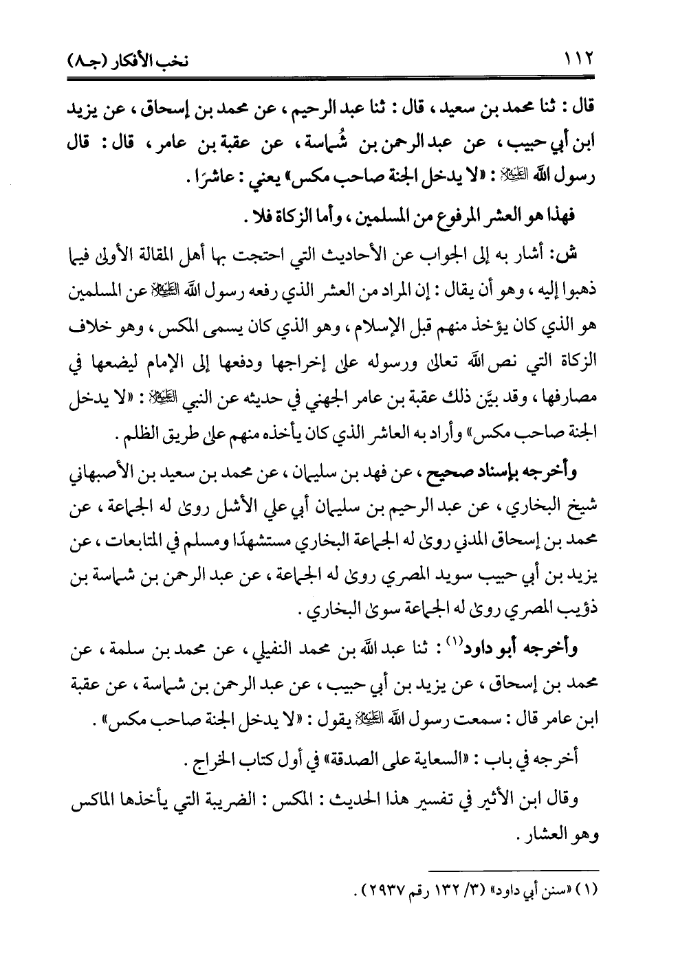 قال: ثنا محمَّد بن سعيد، قال: ثنا عبد الرحيم، عن محمَّد بن إسحاق، عن يزيد ابن أبي حبيب، عن عبد الرحمن بن شُماسة، عن عقبة بن عامر، قال: قال رسول الله - عليه السلام -: "لا يدخل الجنة صاحب مكس" يعني: عاشرًا.