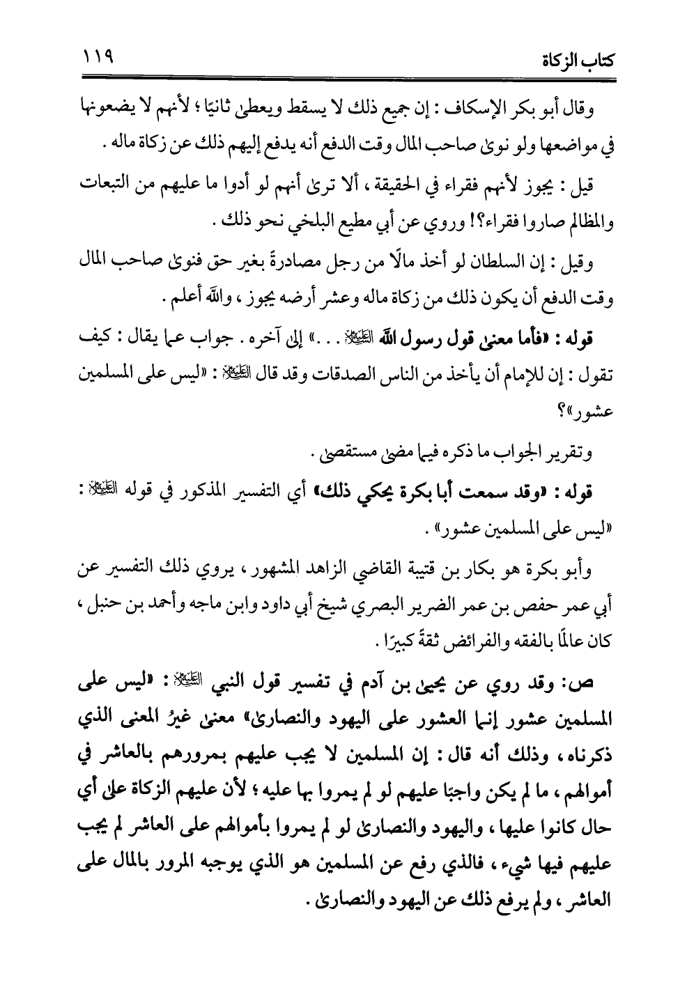 ص: وقد روي عن يحيى بن آدم في تفسير قول النبي - عليه السلام -: "ليس على المسلمين عشور إنما العشور على اليهود والنصارى" معنى غيرُ المعنى الذي ذكرناه، وذلك أنه قال: إن المسلمين لا يجب عليهم بمرورهم بالعاشر في أموالهم، ما لم يكن واجبًا عليهم لو لم يمروا بها عليه؛ لأن عليهم الزكاة على أي حال كانوا عليها، واليهود والنصارى لو لم يمروا بأموالهم على العاشر لم يجب عليهم فيها شيء، فالذي رفع عن المسلمين هو الذي يوجبه المرور بالمال على العاشر، ولم يرفع ذلك عن اليهود والنصارى.