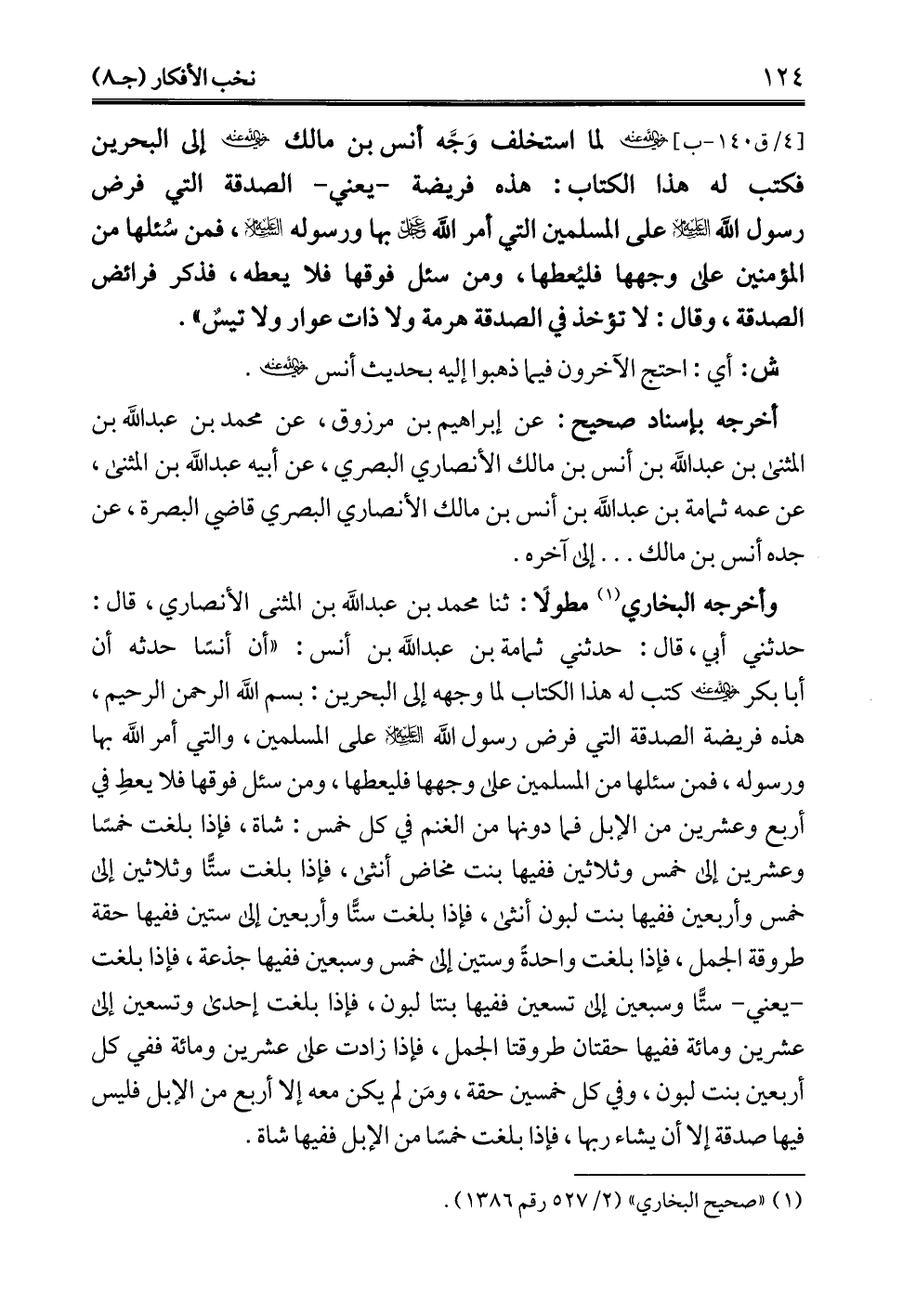 وأخرجه البخاري (¬1) مطولًا: ثنا محمَّد بن عبد الله بن المثنى الأنصاري، قال: حدثني أبي، قال: حدثني ثمامة بن عبد الله بن أنس: "أن أنسًا حدثه أن أبا بكر- رضي الله عنه - كتب له هذا الكتاب لما وجهه إلى البحرين: بسم الله الرحمن الرحيم، هذه فريضة الصدقة التي فرض رسول الله - عليه السلام - على المسلمين، والتي أمر الله بها ورسوله، فمن سئلها من المسلمين على وجهها فليعطها، ومن سئل فوقها فلا يعطِ في أربع وعشرين من الإبل فما دونها من الغنم في كل خمس: شاة، فإذا بلغت خمسًا وعشرين إلى خمس وثلاثين ففيها بنت مخاض أنثى، فإذا بلغت ستًّا وثلاثين إلى خمس وأربعين ففيها بنت لبون أنثى، فإذا بلغت ستًّا وأربعين إلى ستين ففيها حقة طروقة الجمل، فإذا بلغت واحدةً وستين إلى خمس وسبعين ففيها جذعة، فإذا بلغت -يعني- ستًّا وسبعين إلى تسعين ففيها بنتا لبون، فإذا بلغت إحدى وتسعين إلى عشرين ومائة ففيها حقتان طروقتا الجمل، فإذا زادت على عشرين ومائة ففي كل أربعين بنت لبون، وفي كل خمسين حقة، ومَن لم يكن معه إلا أربع من الإبل فليس فيها صدقة إلا أن يشاء ربها، فإذا بلغت خمسًا من الإبل ففيها شاة.