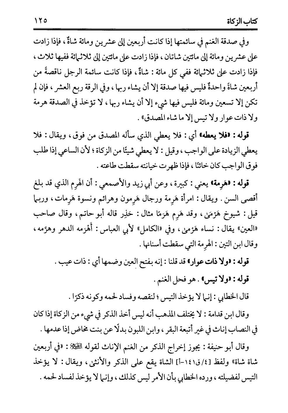 وقال أبو حنيفة: يجوز إخراج الذكر من الغنم الإناث لقوله - عليه السلام -: "في أربعين شاة شاة" ولفظ الشاة يقع على الذكر والأنثى، ويقال: لا يؤخذ التيس لفضيلته، ورده الخطابي بأن الأمر ليس كذلك، وإنما لا يؤخذ لفساد لحمه.