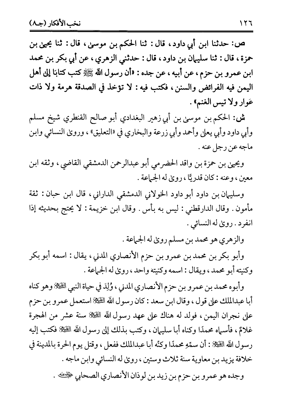 ص: حدثنا ابن أبي داود، قال: ثنا الحكم بن موسى، قال: ثنا يحيى بن حمزة، قال: ثنا سليمان بن داود، قال: حدثني الزهري، عن أبي بكر بن محمَّد ابن عمرو بن حزم، عن أبيه، عن جده: "أن رسول الله - صلى الله عليه وسلم - كتب كتابًا إلى أهل اليمن فيه الفرائض والسنن، فكتب فيه: لا تؤخذ في الصدقة هرمة ولا ذات عَوار ولا تيس الغنم".