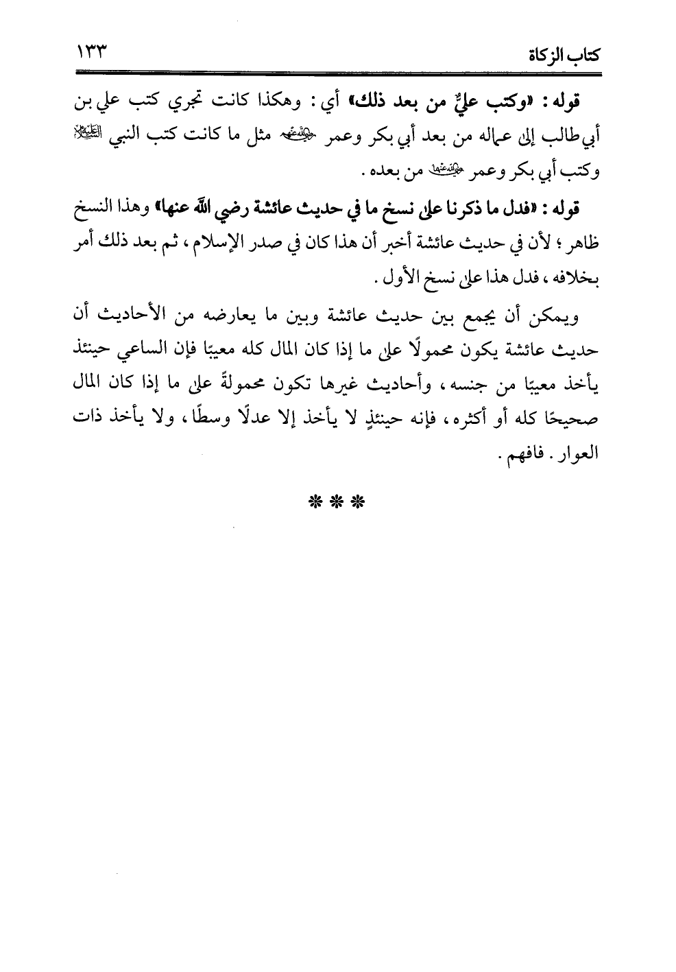 ويمكن أن يجمع بين حديث عائشة وبين ما يعارضه من الأحاديث أن حديث عائشة يكون محمولًا على ما إذا كان المال كله معيبًا فإن الساعي حينئذ يأخذ معيبًا من جنسه، وأحاديث غيرها تكون محمولةً على ما إذا كان المال صحيحًا كله أو أكثره، فإنه حينئذٍ لا يأخذ إلا عدلًا وسطًا، ولا يأخذ ذات العوار. فافهم.